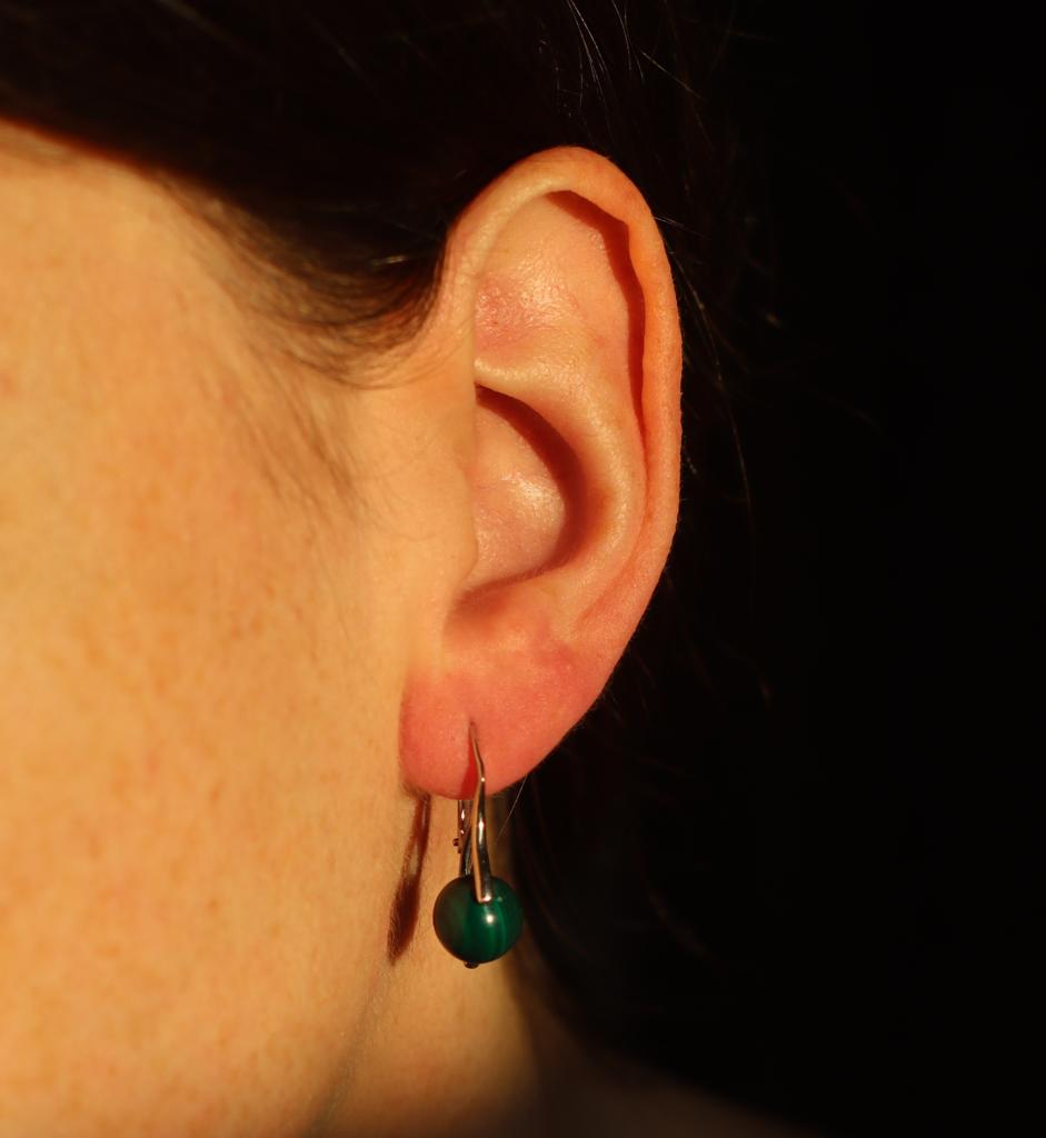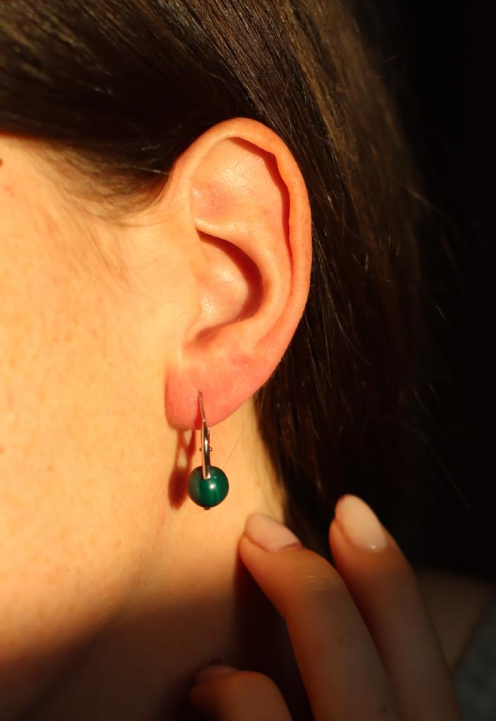 Ręcznie wykonane kolczyki Carmen z kulek malachitu o średnicy 8 mm i srebra pr. 925