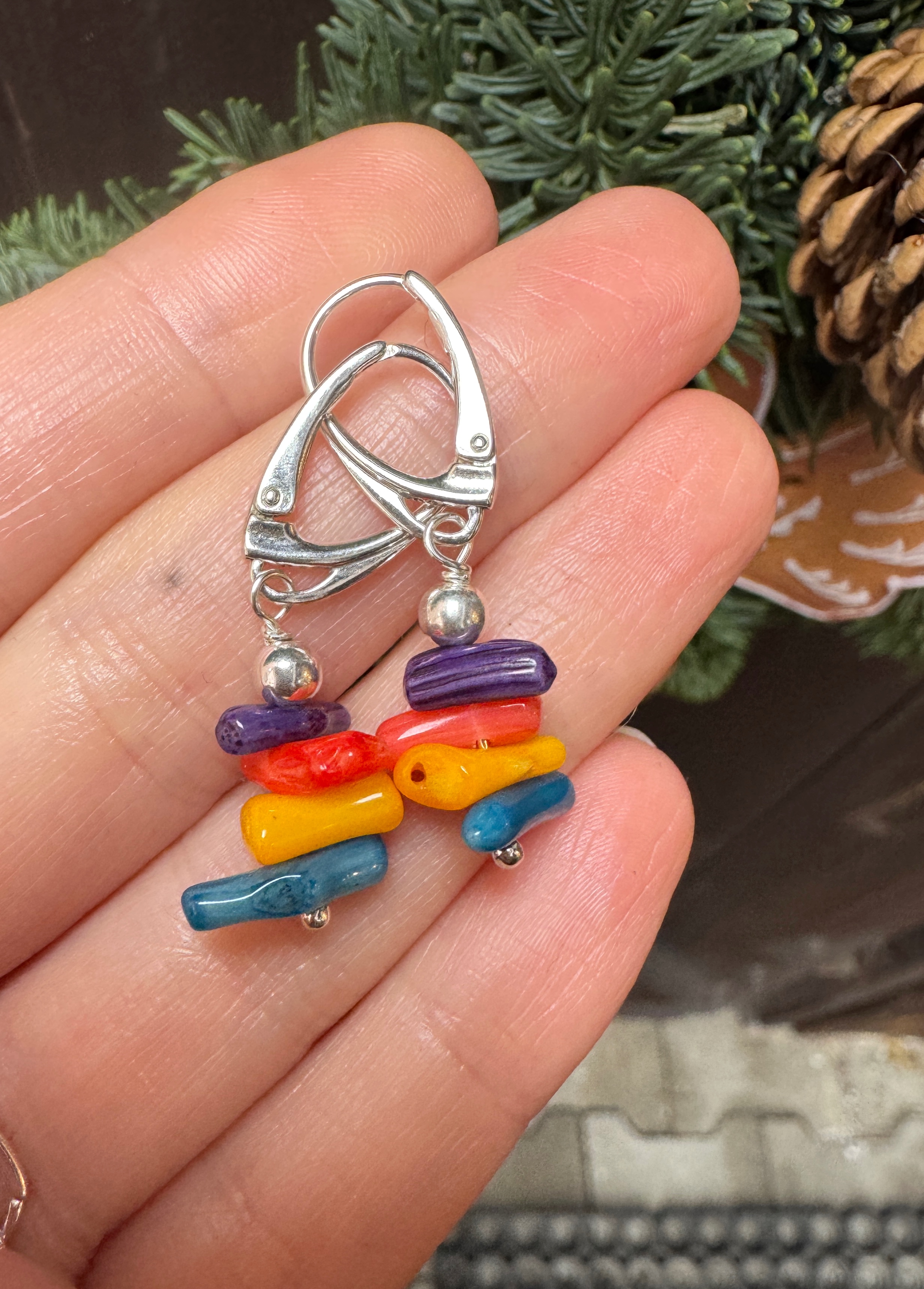 Ręcznie wykonane kolczyki z korala kolorowego w kształcie podłużnych patyczków i srebra pr. 925