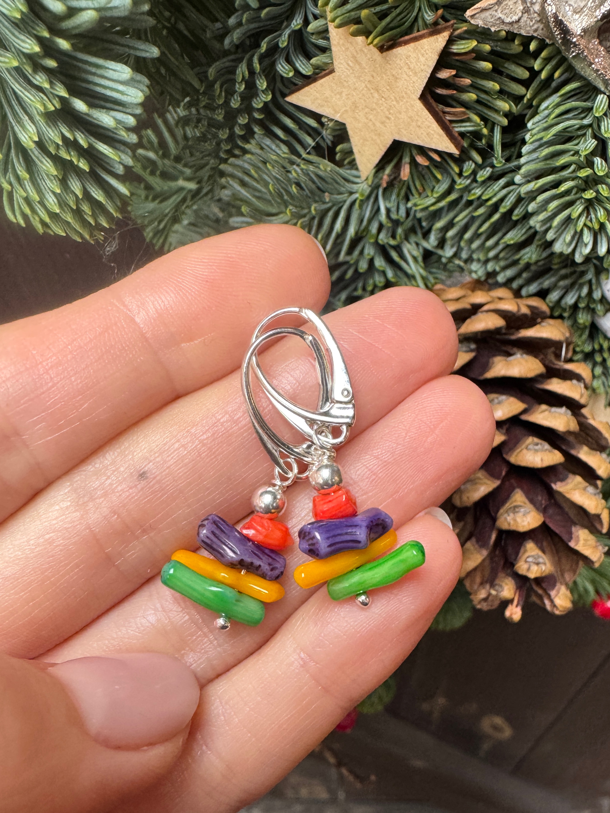 Ręcznie wykonane kolczyki z korala kolorowego w kształcie podłużnych patyczków i srebra pr. 925