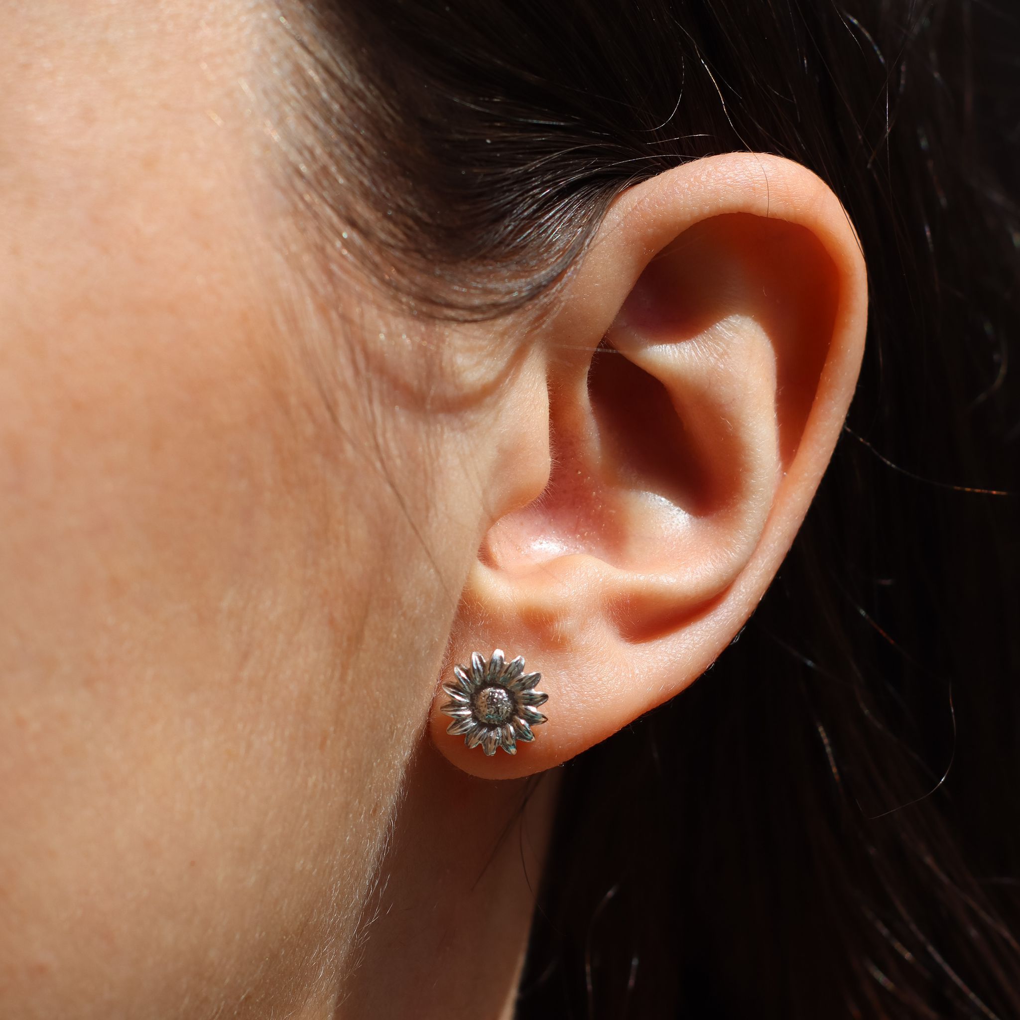 Kolczyki wkrętki z motywem słonecznika wykonane ze srebra pr.925.