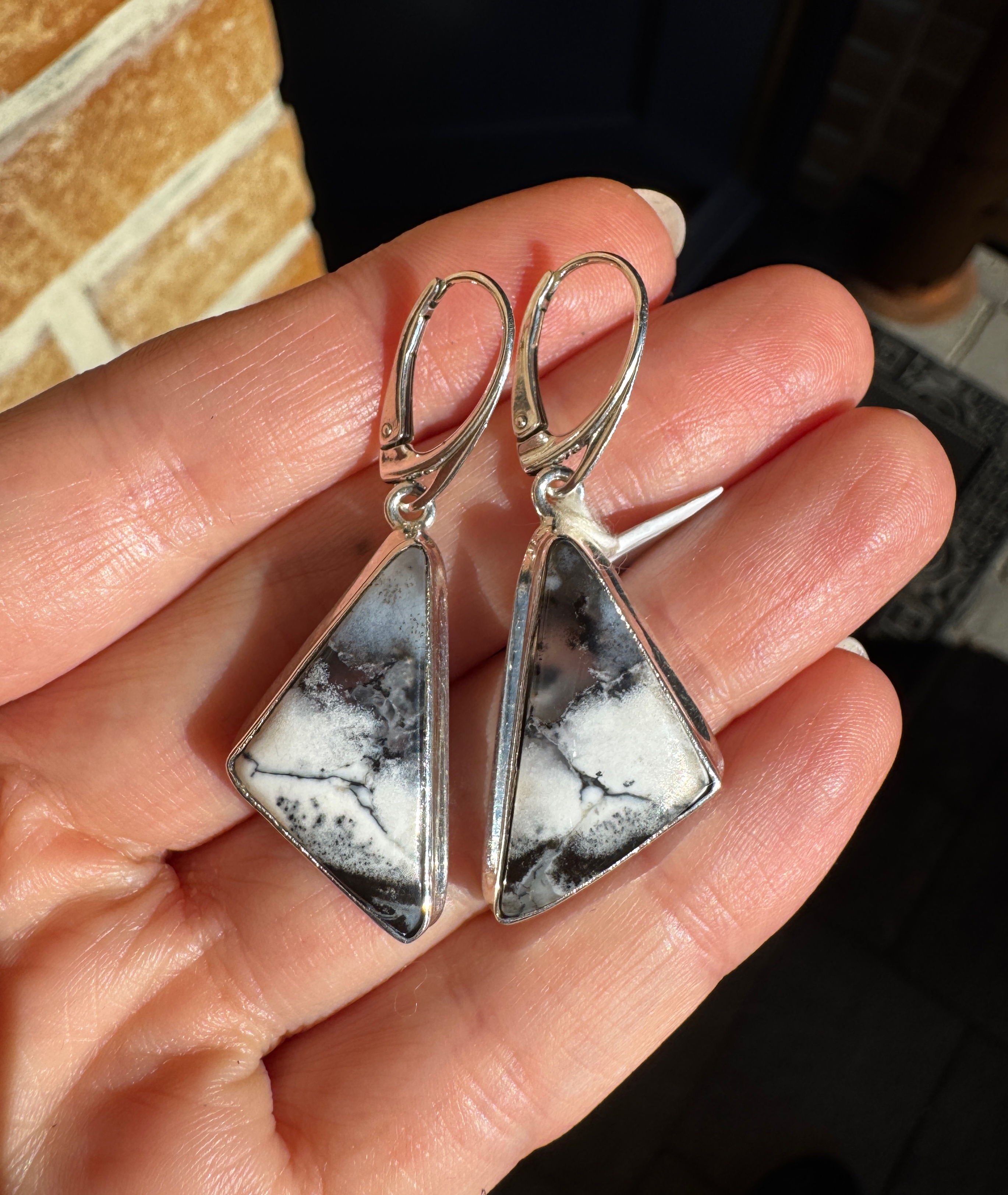 Ręcznie wykonane kolczyki z płaskich agatów dendrytowych biało-czarnych i srebra pr. 925
