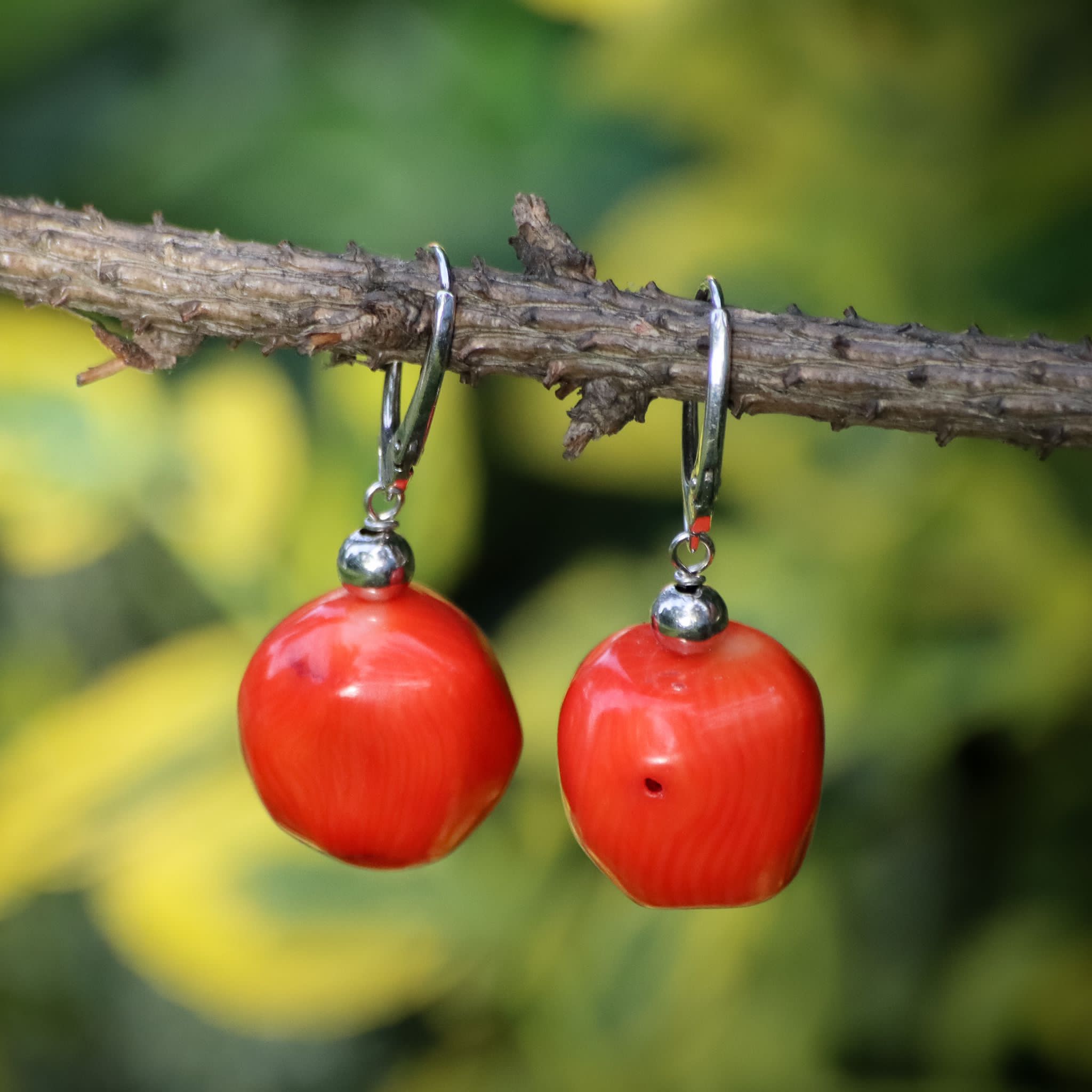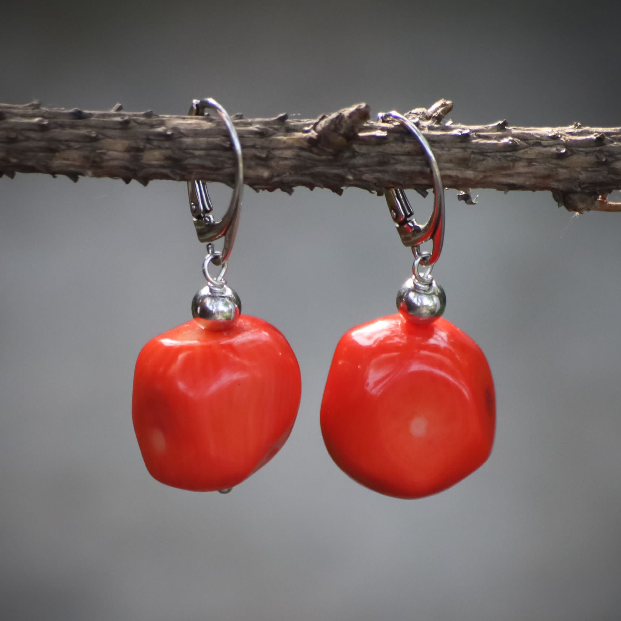 Ręcznie wykonane kolczyki z korala pomarańczowego w kształcie bryłki i srebra pr. 925
