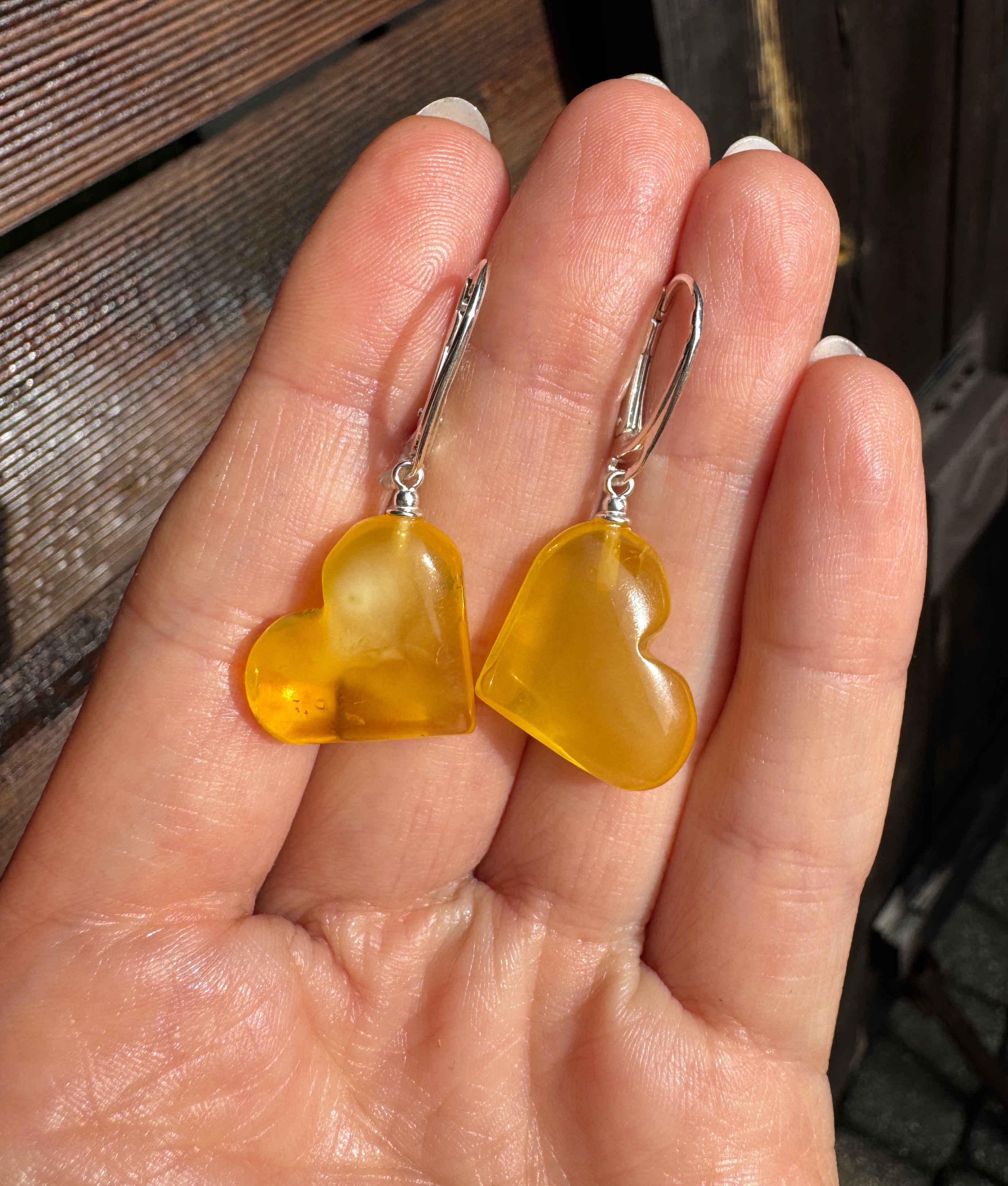 Ręcznie wykonane kolczyki z bursztynów w kształcie serc i srebra pr. 925