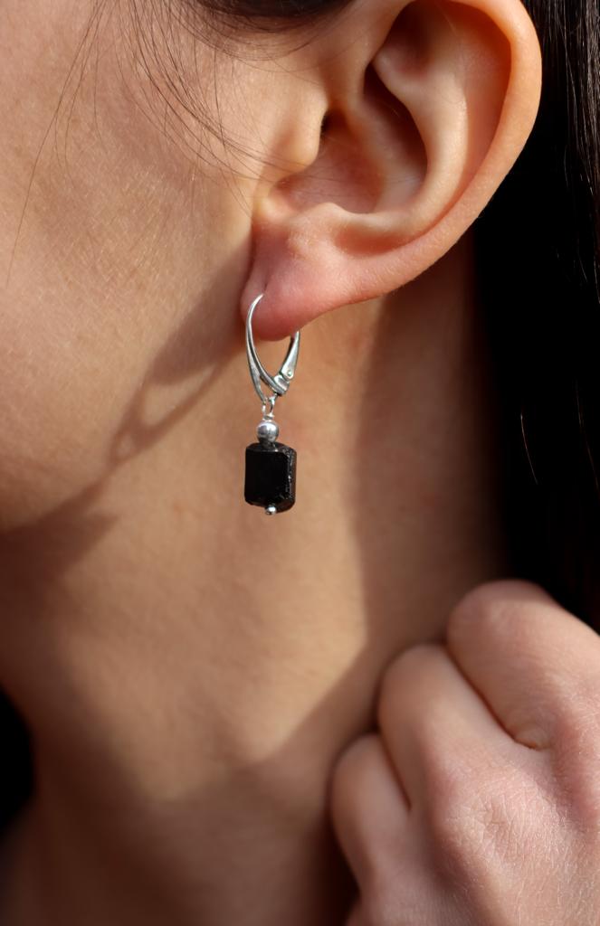 Ręcznie wykonane kolczyki z bryłek czarnego turmalinu i srebra pr. 925