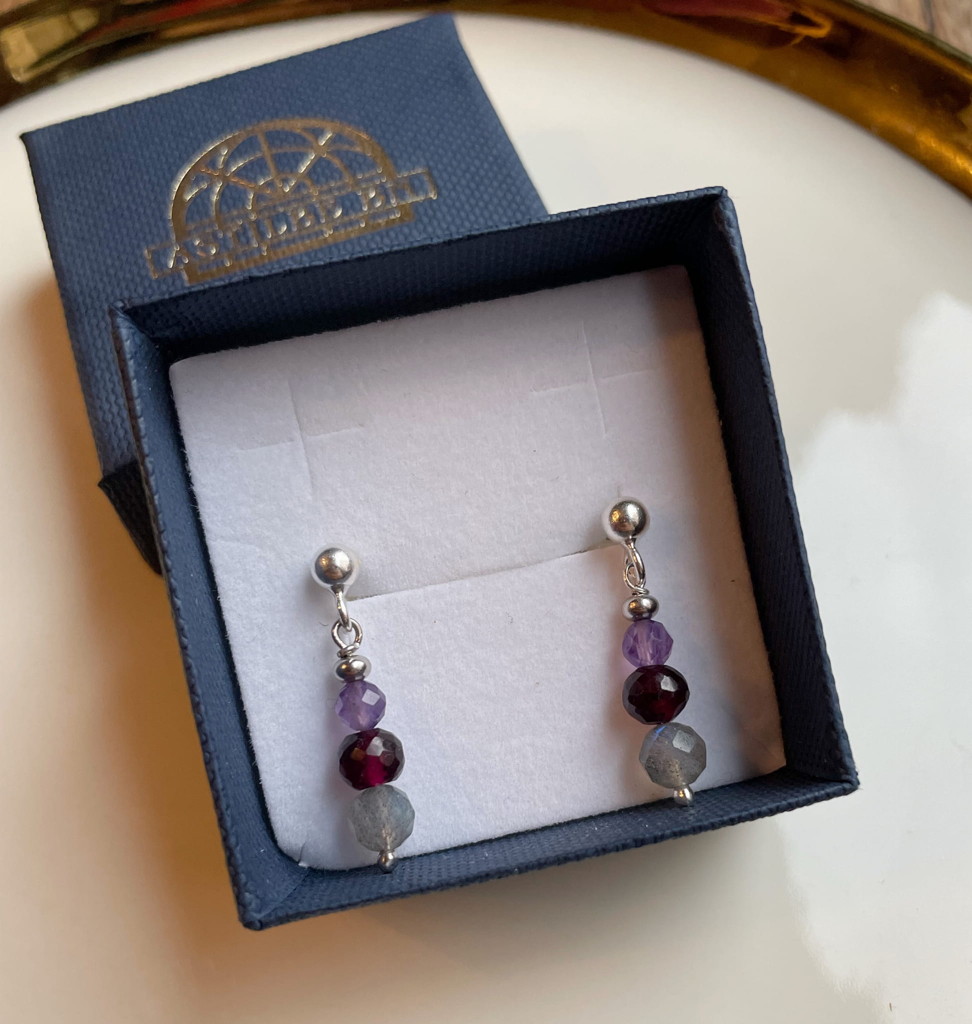 Ręcznie wykonane kolczyki z drobnego, fasetowanego labradorytu, ametystu i granatu oraz srebra pr. 925
