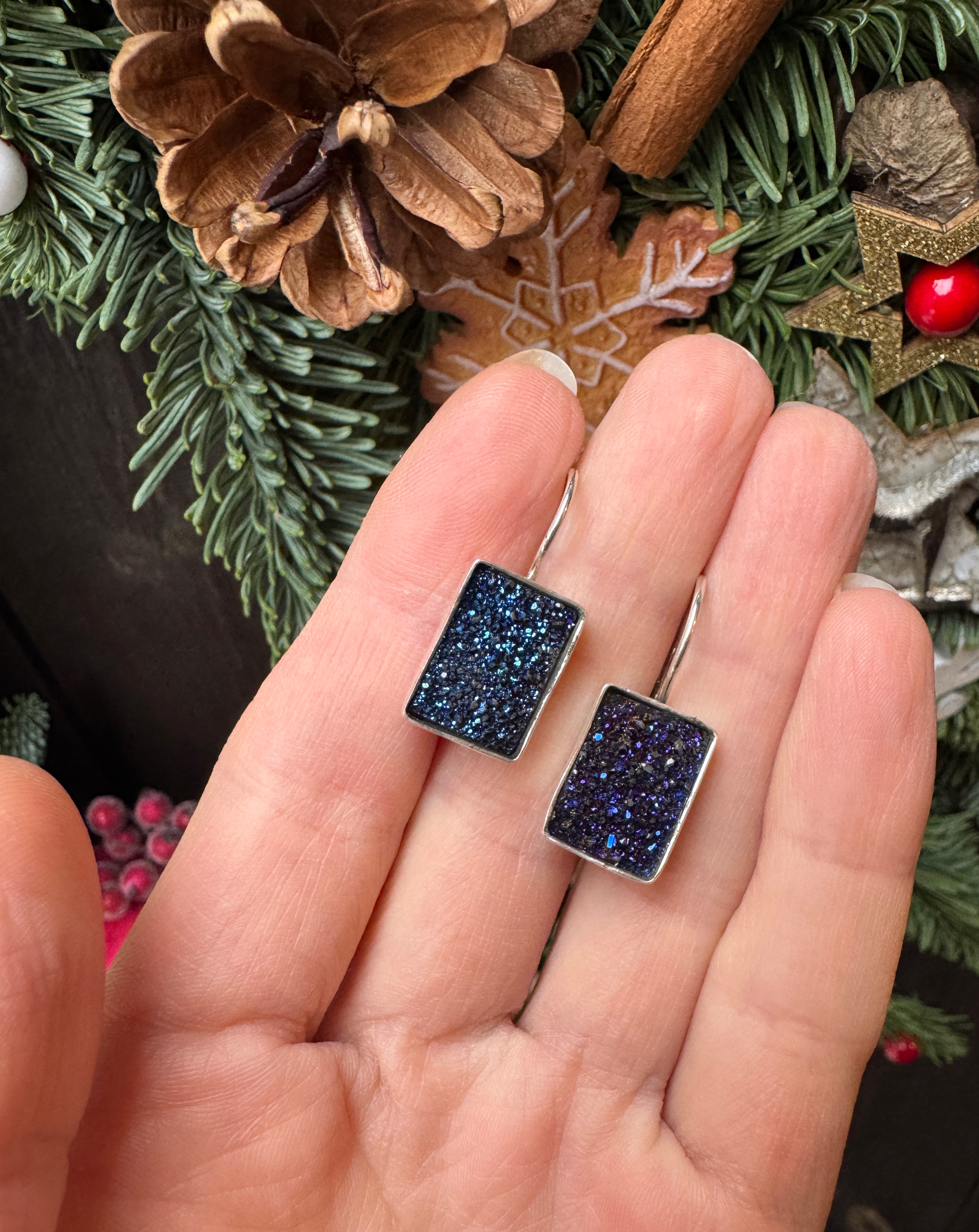 Ręcznie wykonane kolczyki z druz agatowych w kształcie prostokąta oprawionych w srebro pr. 925