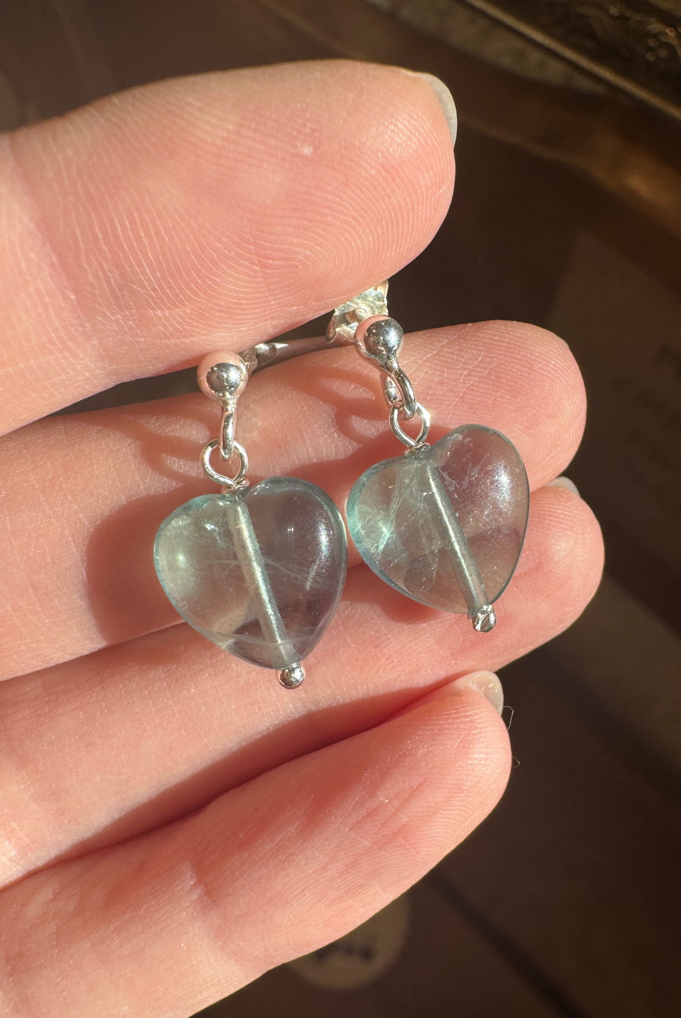 Ręcznie wykonane kolczyki z fluorytow w kształcie serca 12mm i srebra pr. 925