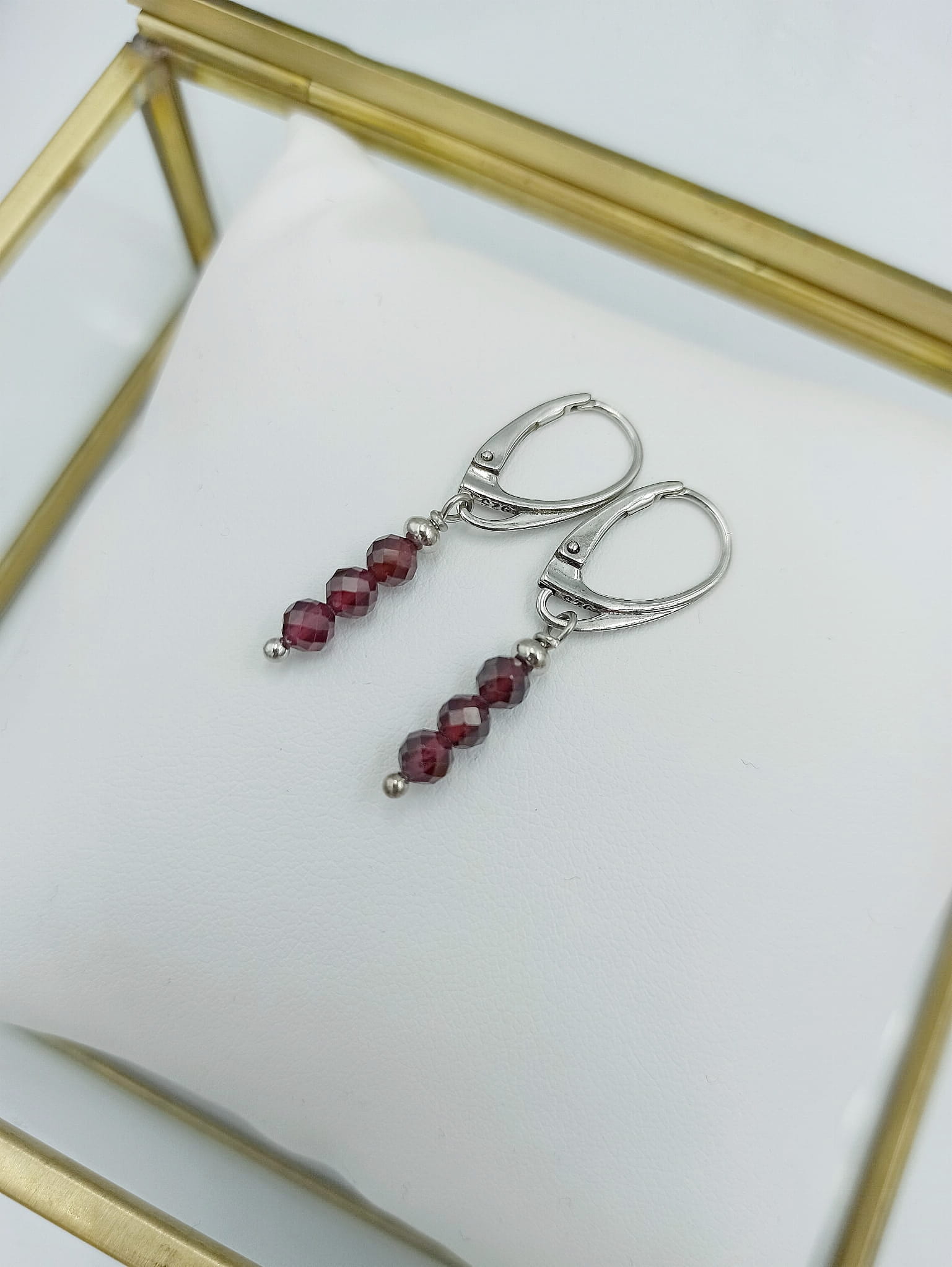 Ręcznie wykonane kolczyki z niedużych, fasetowanych granatów w kolorze wina i srebra pr. 925