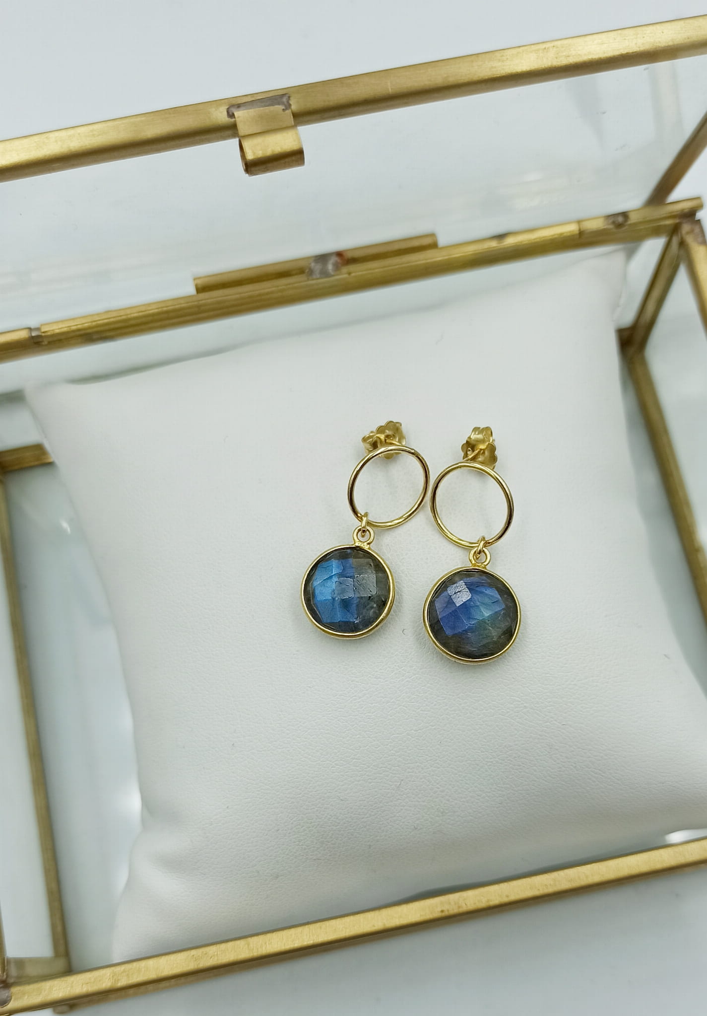 Ręcznie wykonane kolczyki z oprawionych, fasetowanych labradorytów i pozłacanego srebra pr. 925