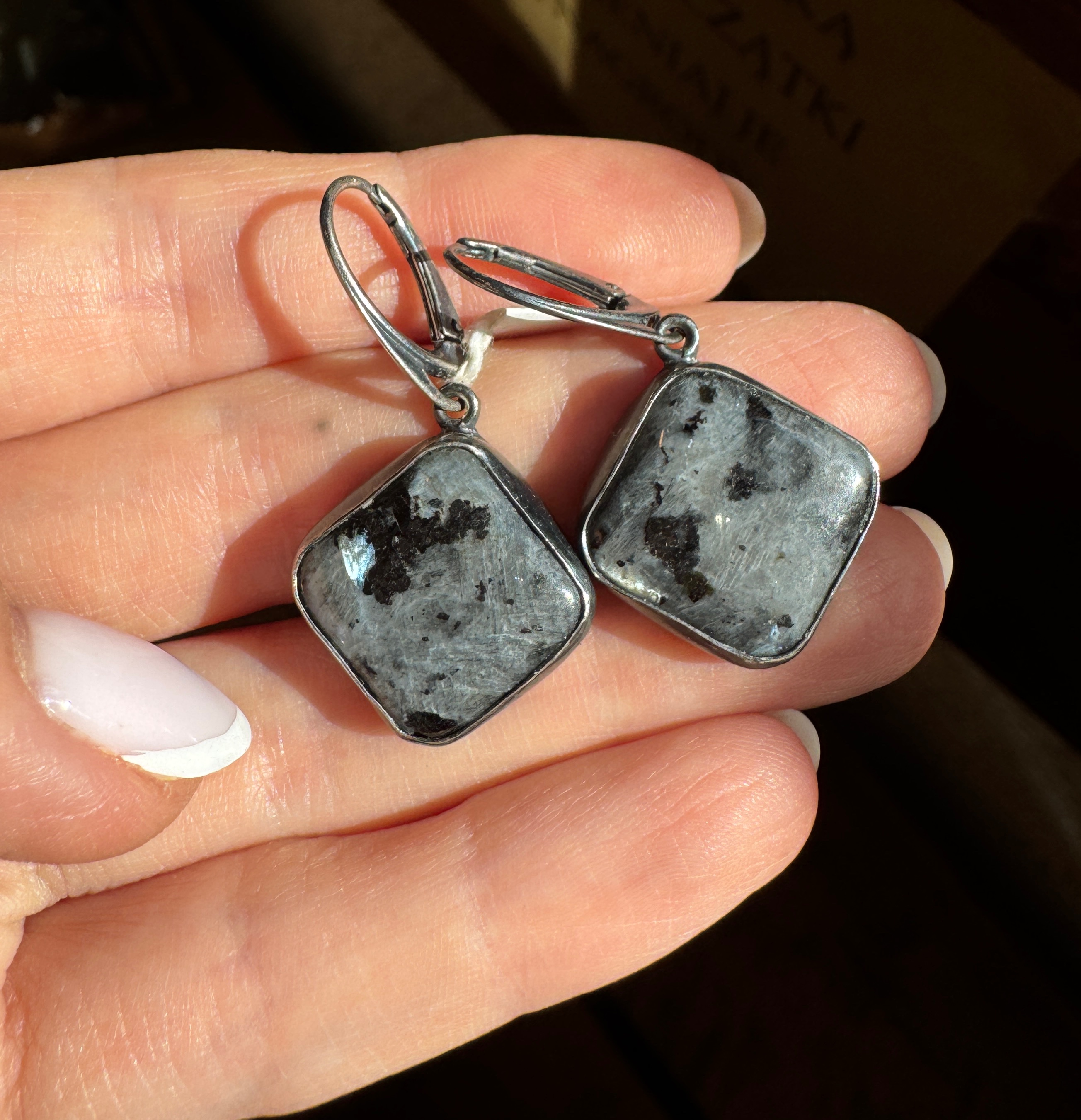 Ręcznie wykonane kolczyki z larvikitu oraz oksydowanego srebra pr. 925