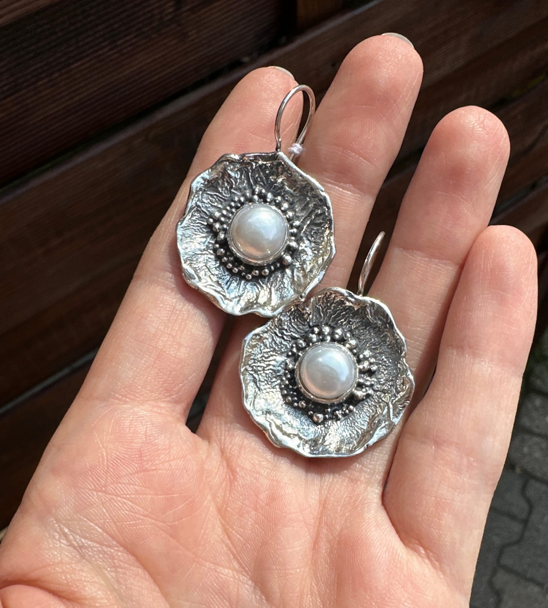 Ręcznie wykonane kolczyki z oprawionych okrągłych pereł hodowanych i srebra pr. 925