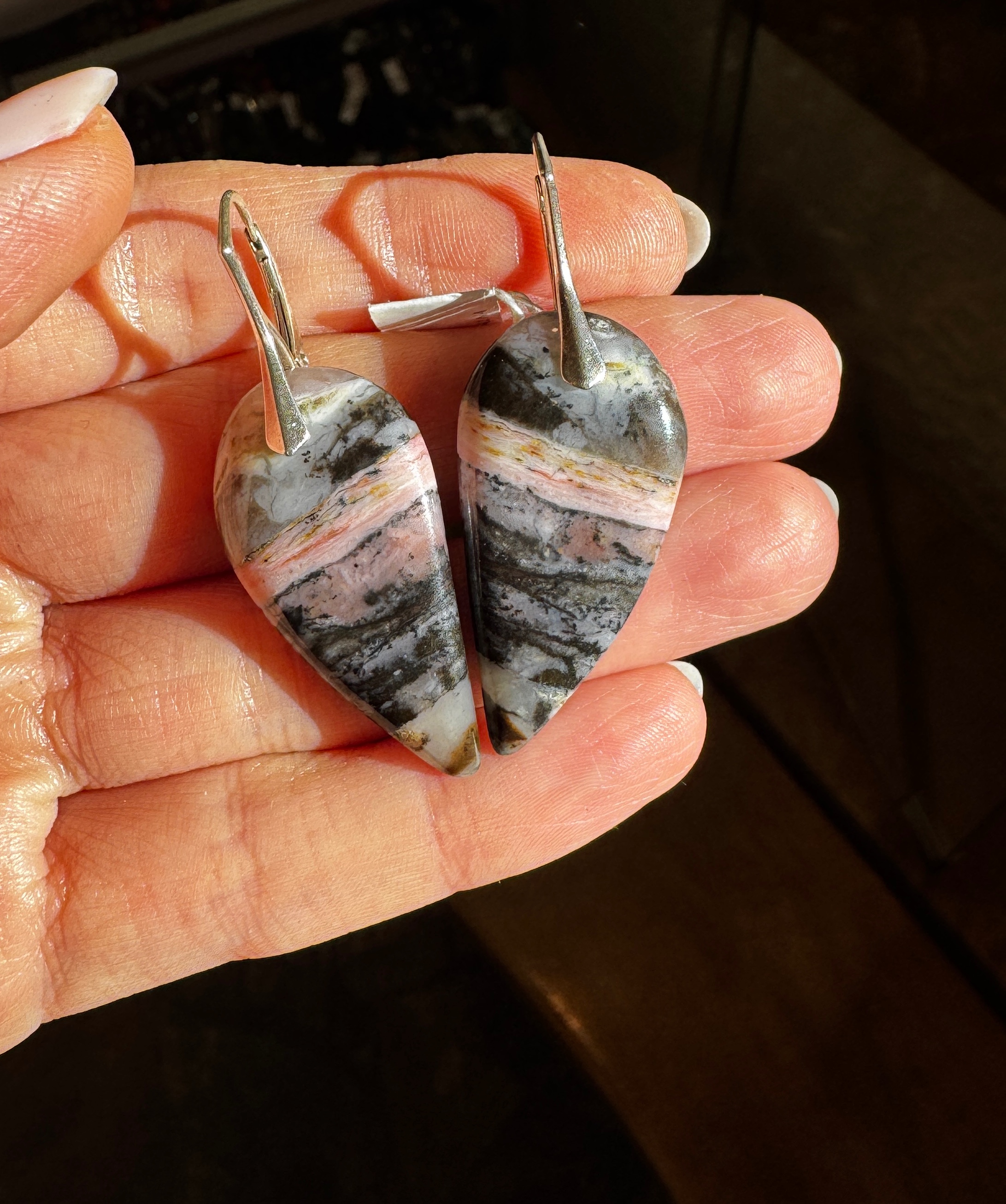 Ręcznie wykonane kolczyki płaskiego jaspisu rodonitu w odcieniu różu i srebra pr. 925