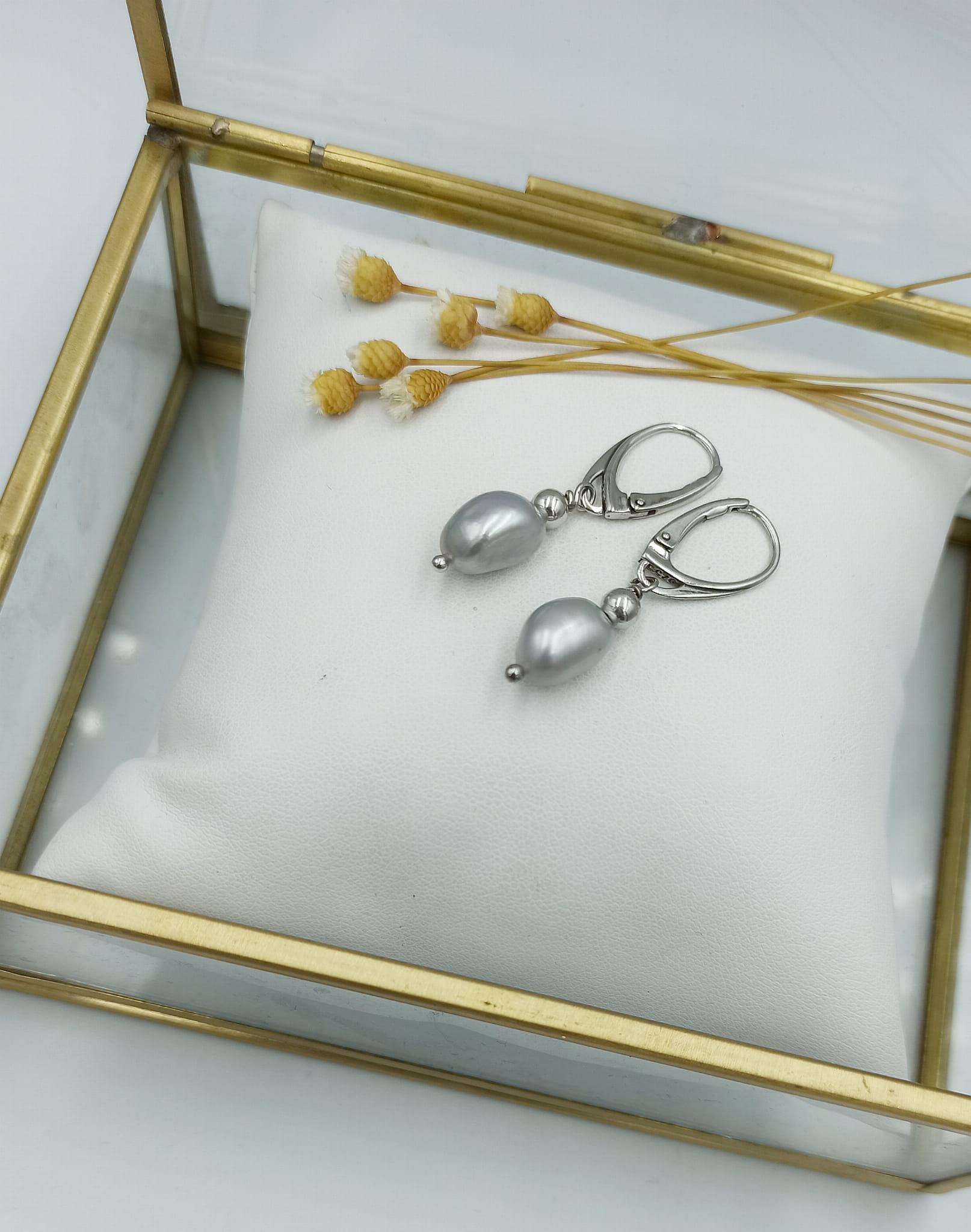 Ręcznie wykonane kolczyki z podłużnych, srebrnych pereł hodowanych i srebra pr. 925