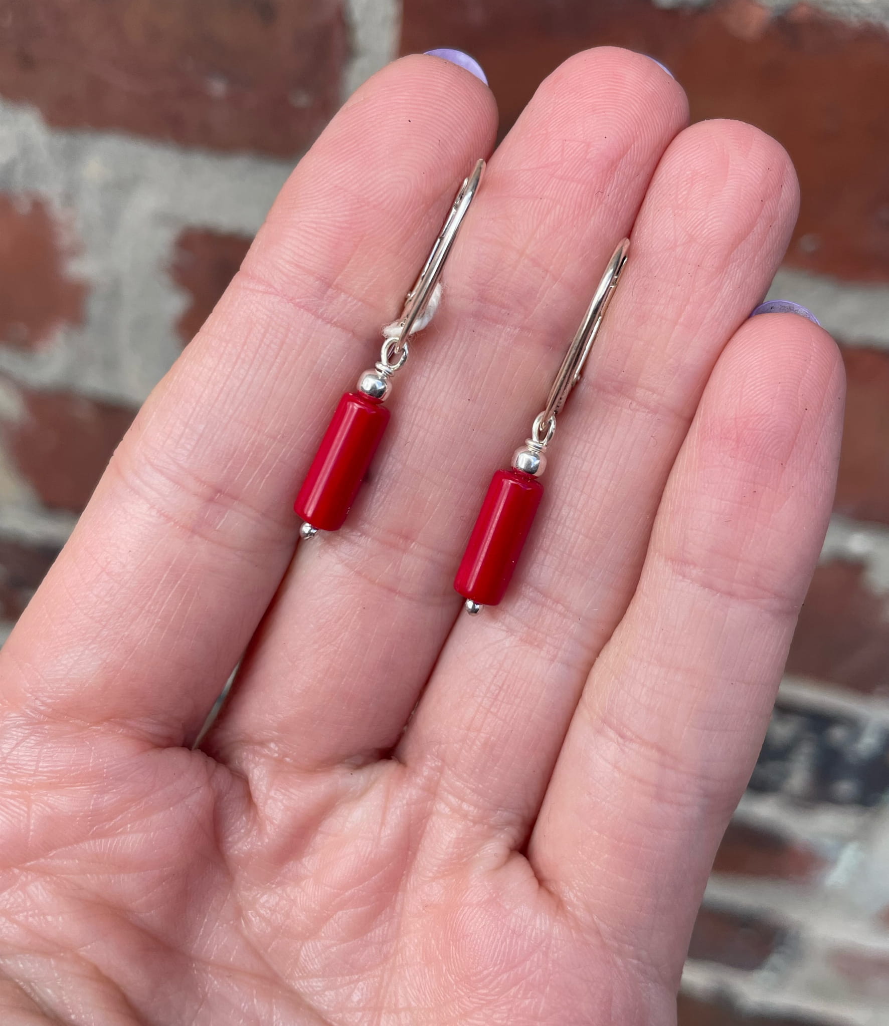 Ręcznie wykonane kolczyki z korala czerwonego w kształcie wałeczków i srebra pr. 925