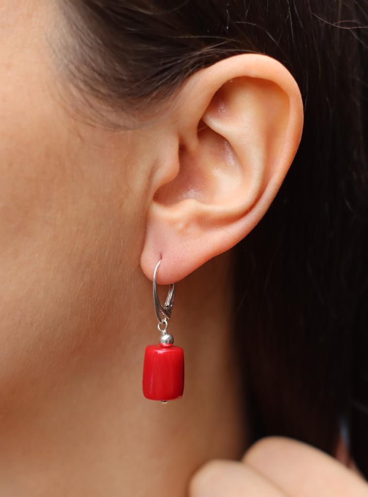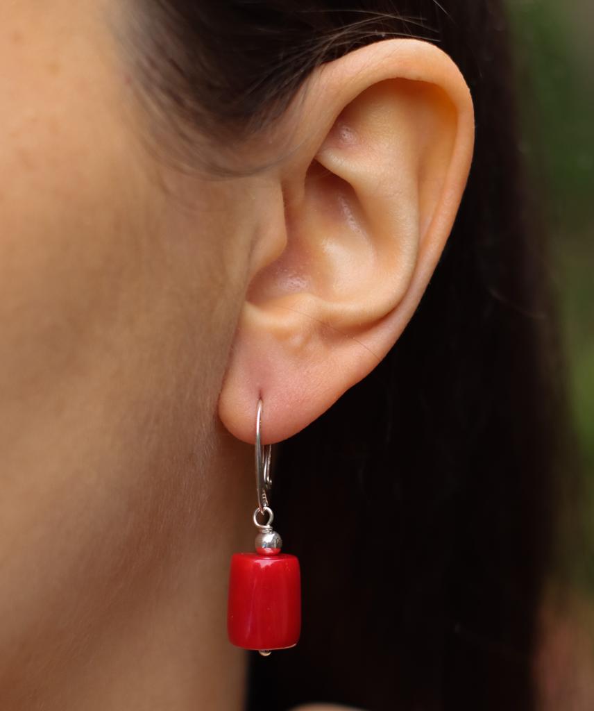 Ręcznie wykonane kolczyki z korala czerwonego w kształcie wałeczków i srebra pr. 925