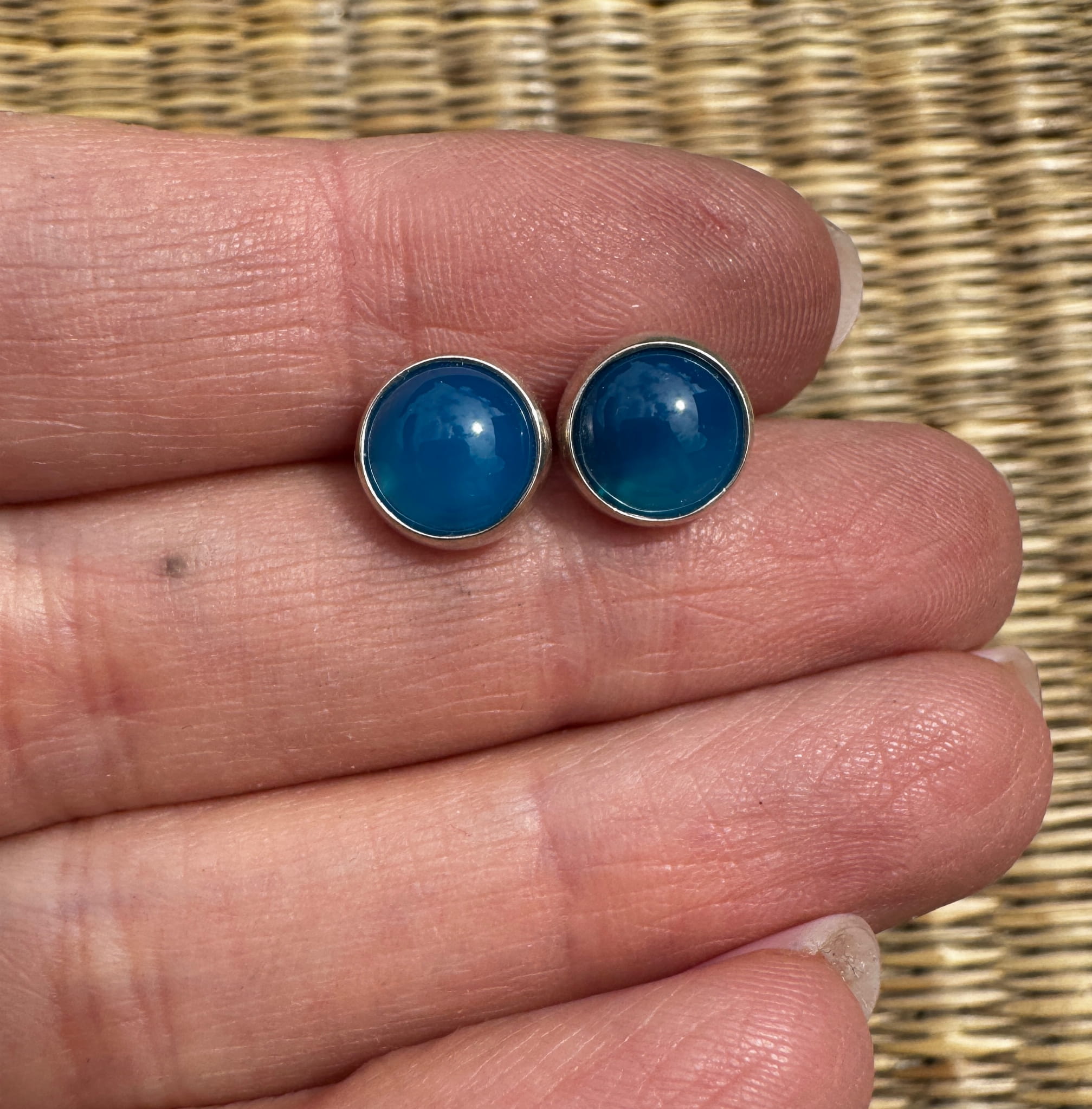 Ręcznie wykonane kolczyki wkrętki z agatu niebieskiego o średnicy 8 mm oprawione w srebro pr. 925