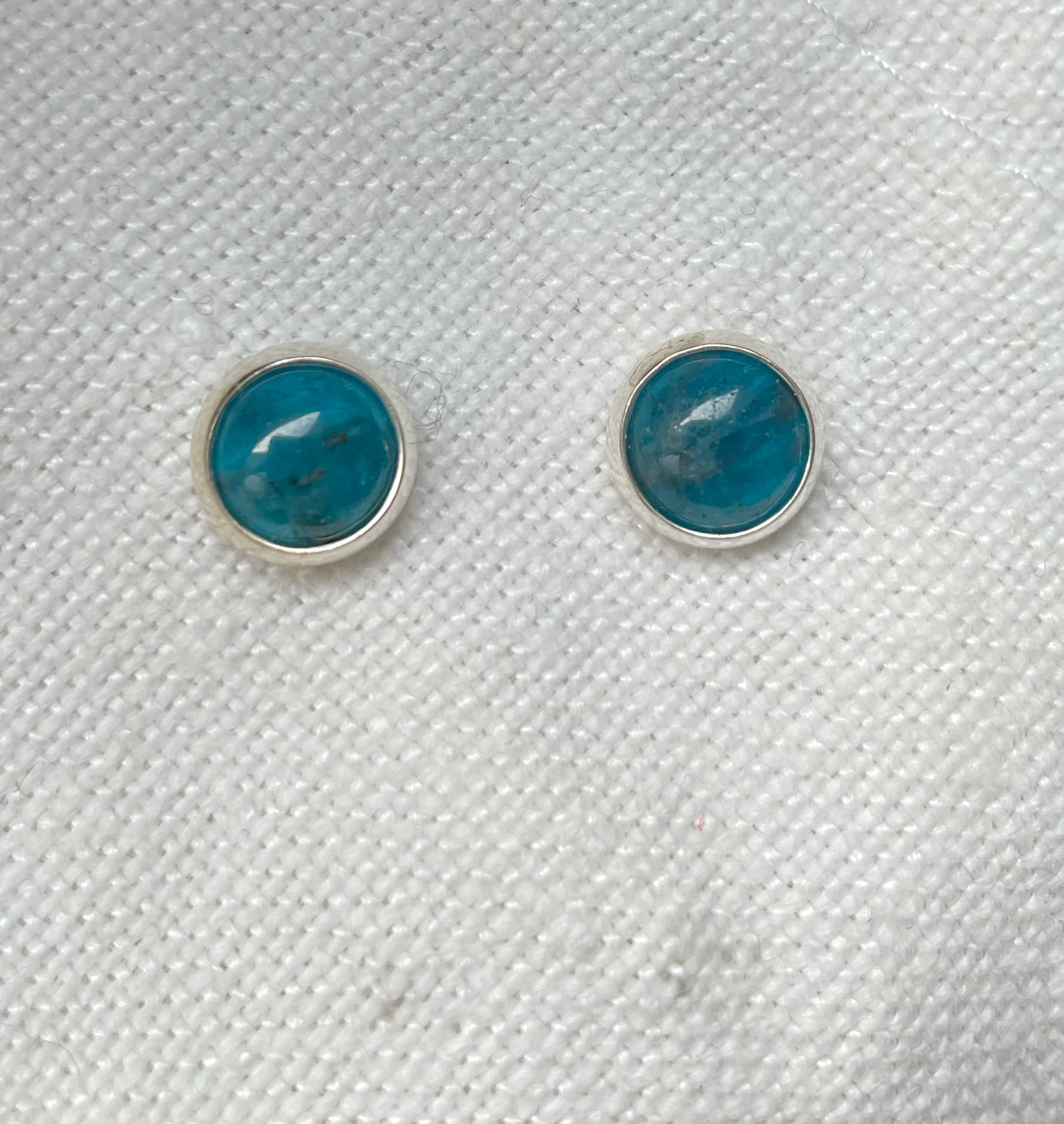 Ręcznie wykonane kolczyki wkrętki z apatytu o średnicy 8 mm oprawionego w srebro pr. 925
