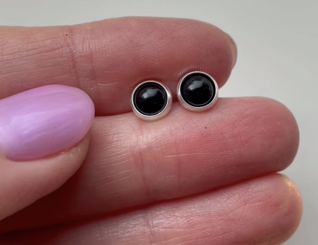 Ręcznie wykonane kolczyki wkrętki z czarnego turmalinu o średnicy 6mm oprawionego w srebro pr. 925