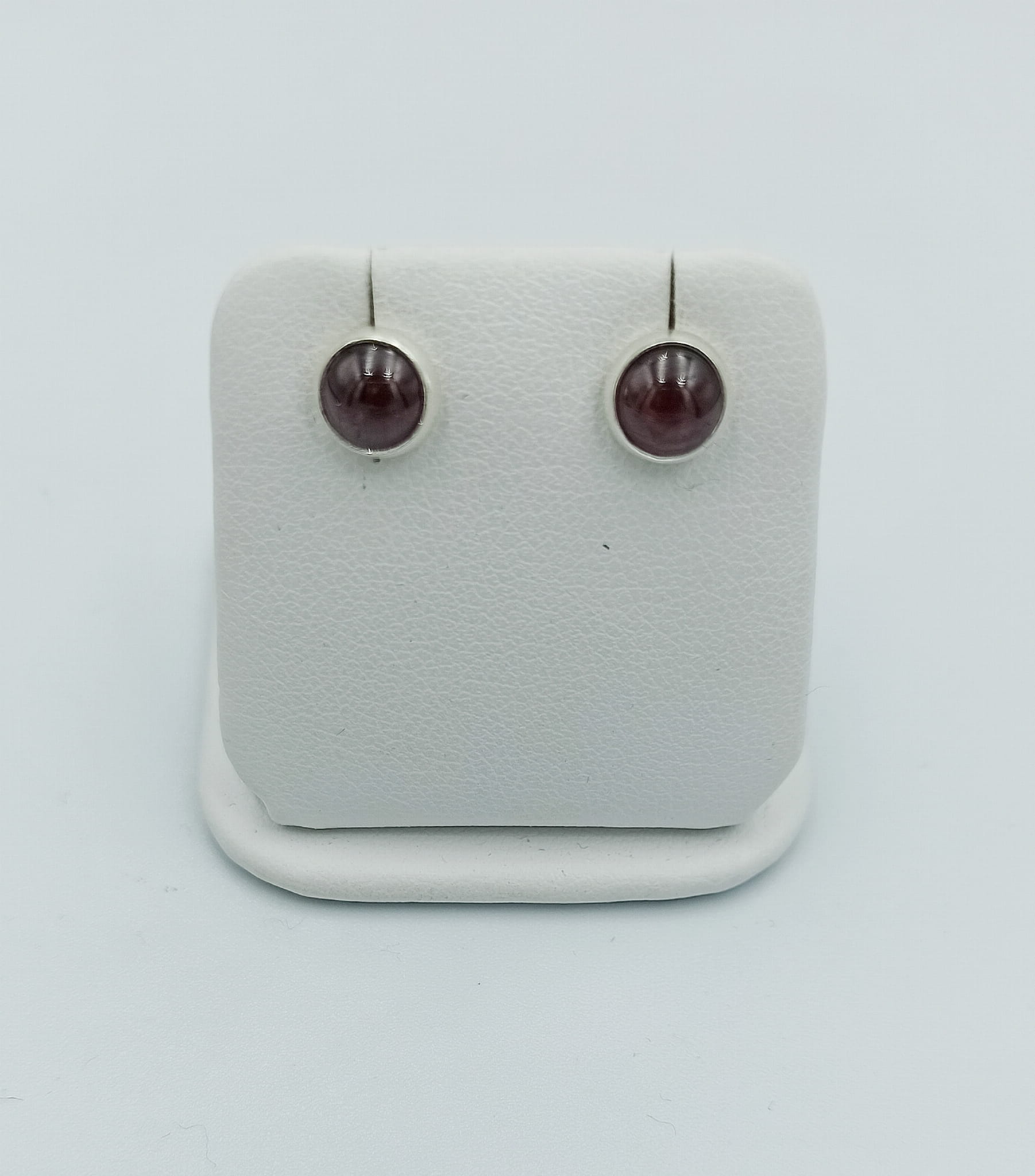 Ręcznie wykonane kolczyki wkrętki z granatu w kolorze ciemnego bordo o średnicy 6 mm oprawione w srebro pr. 925