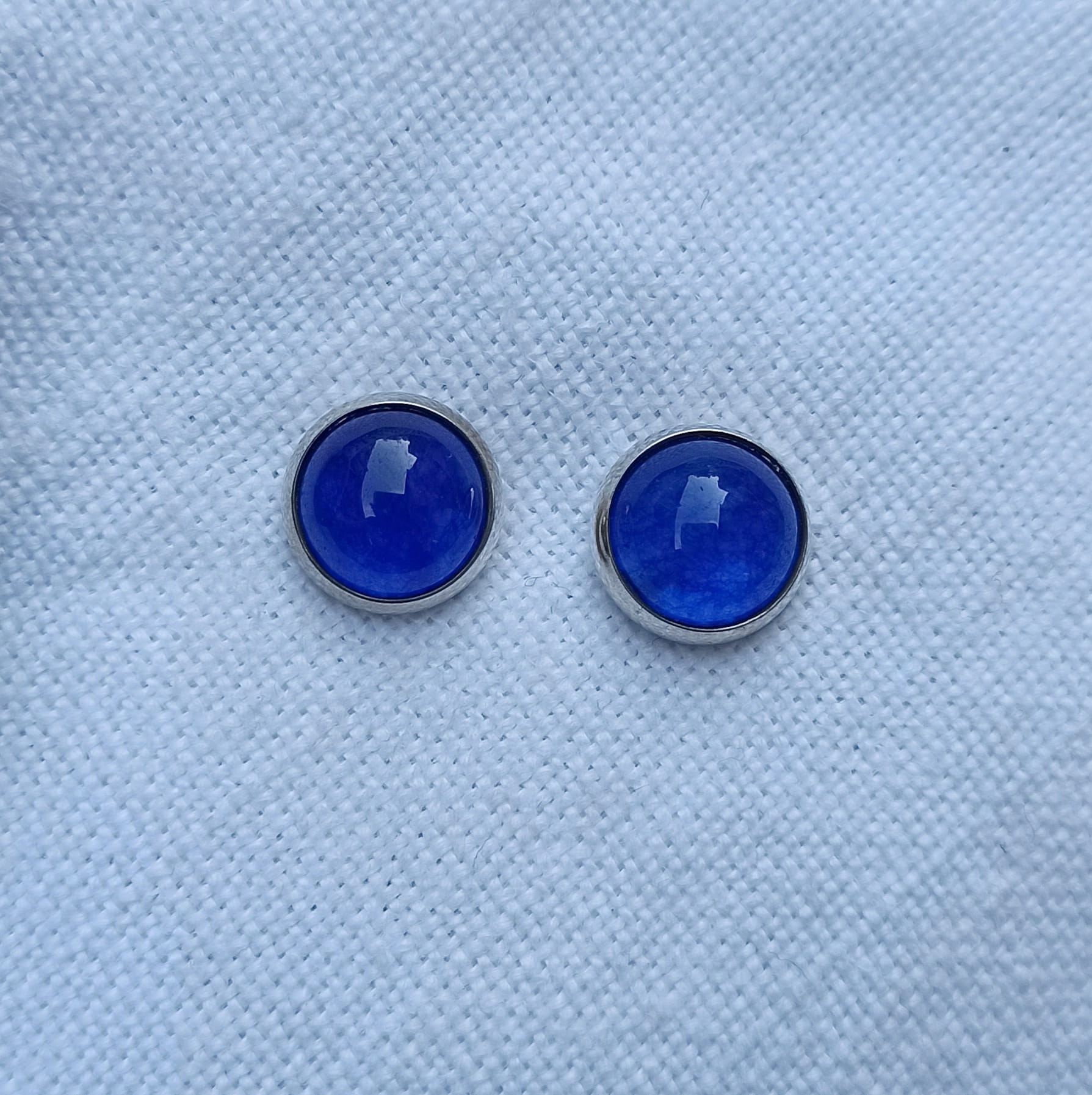 Ręcznie wykonane kolczyki wkrętki z niebieskiego jadeitu o średnicy 10 mm oprawionego w srebro pr. 925