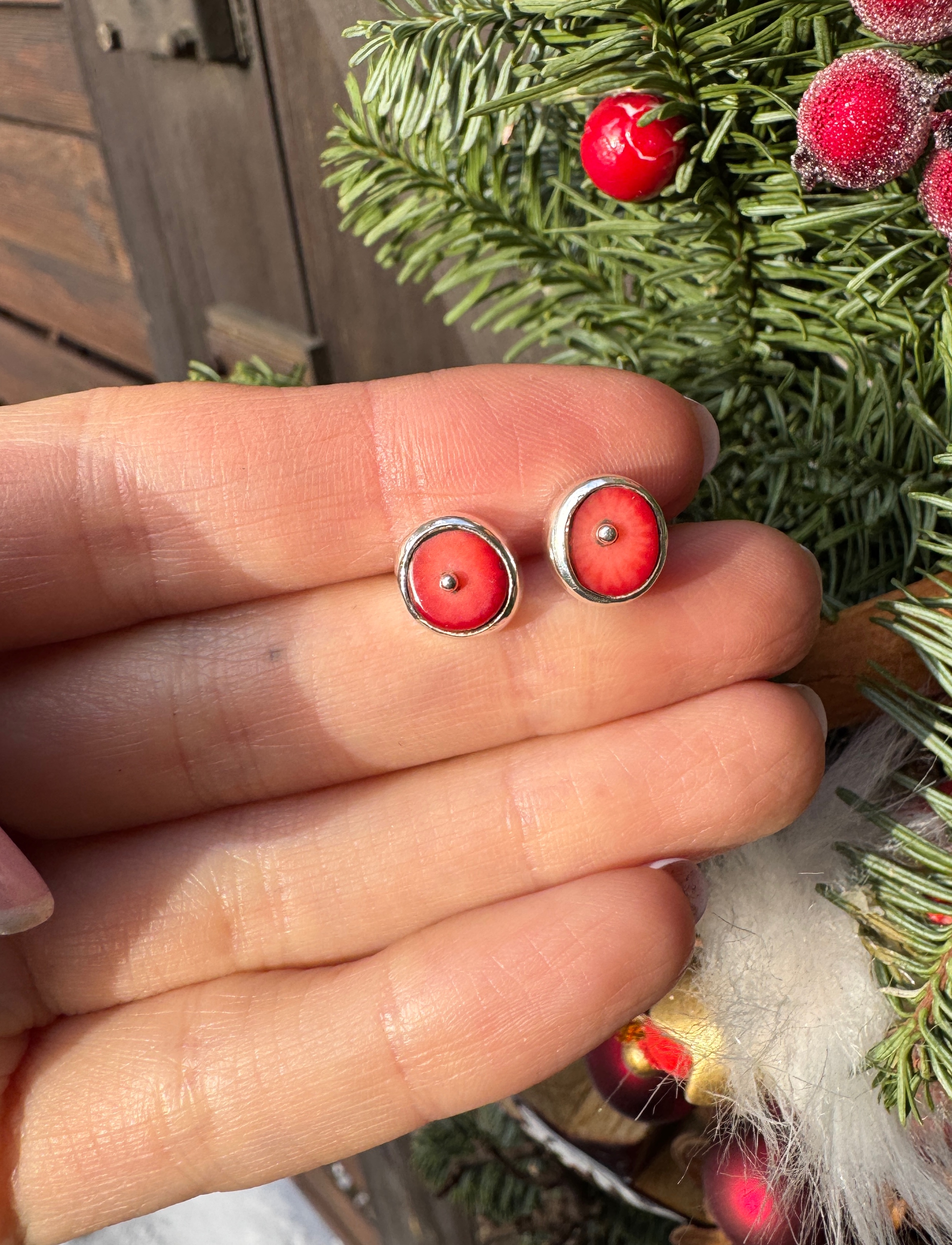 Ręcznie wykonane kolczyki wkrętki z czerwonego korala oprawionego w srebro pr. 925