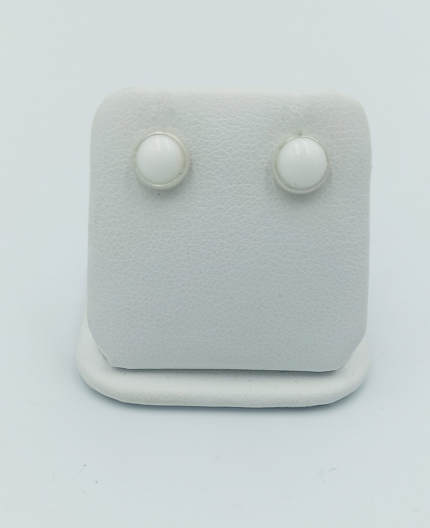 Ręcznie wykonane kolczyki wkrętki z białego magnezytu o średnicy 6 mm oprawionego w srebro pr. 925