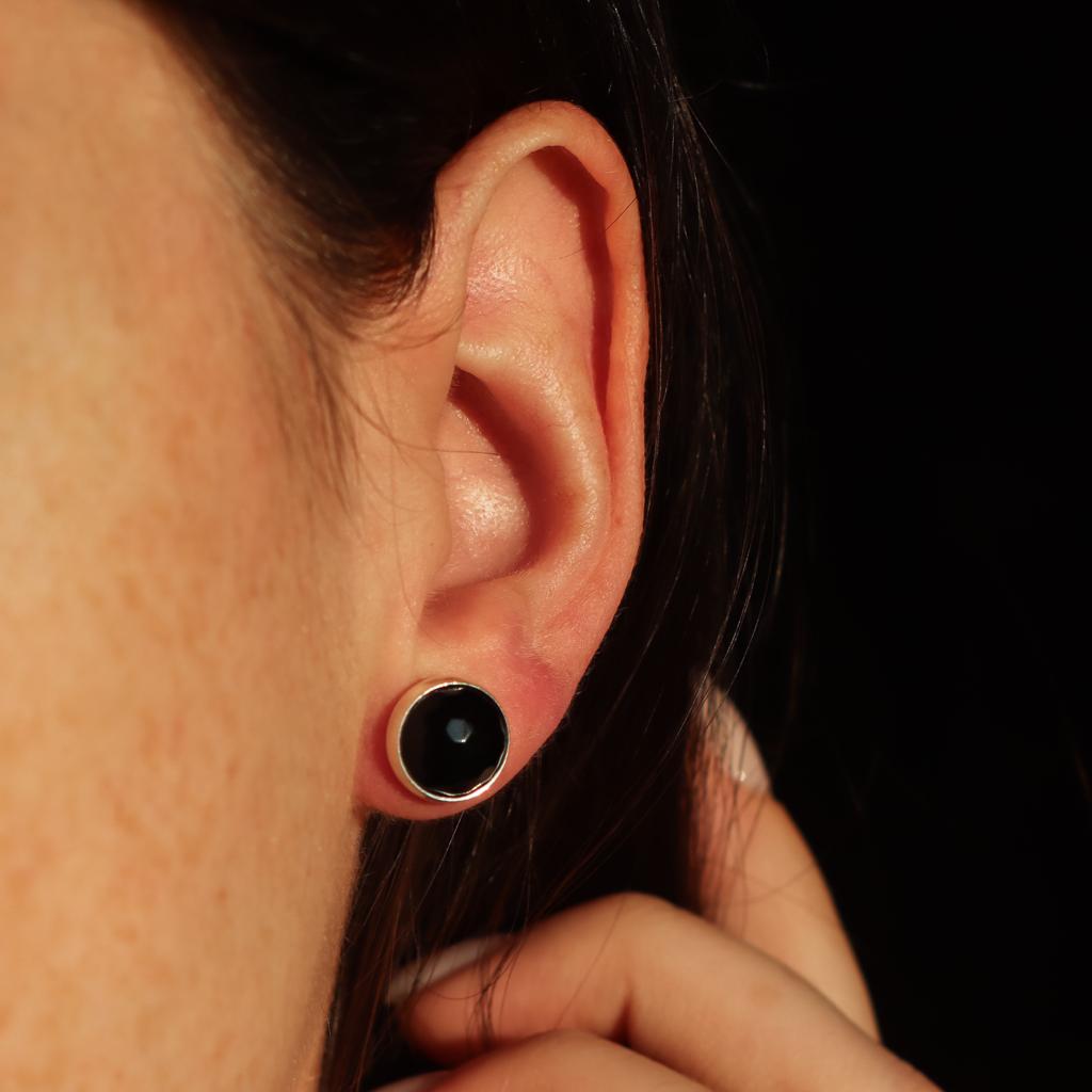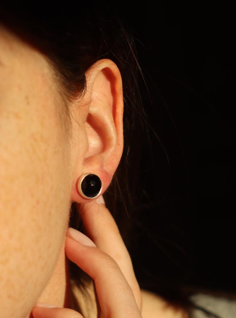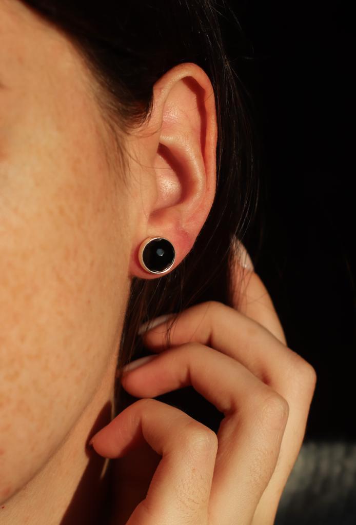 Ręcznie wykonane kolczyki wkrętki z czarnego onyksu o średnicy 10mm oprawionego w srebro pr. 925