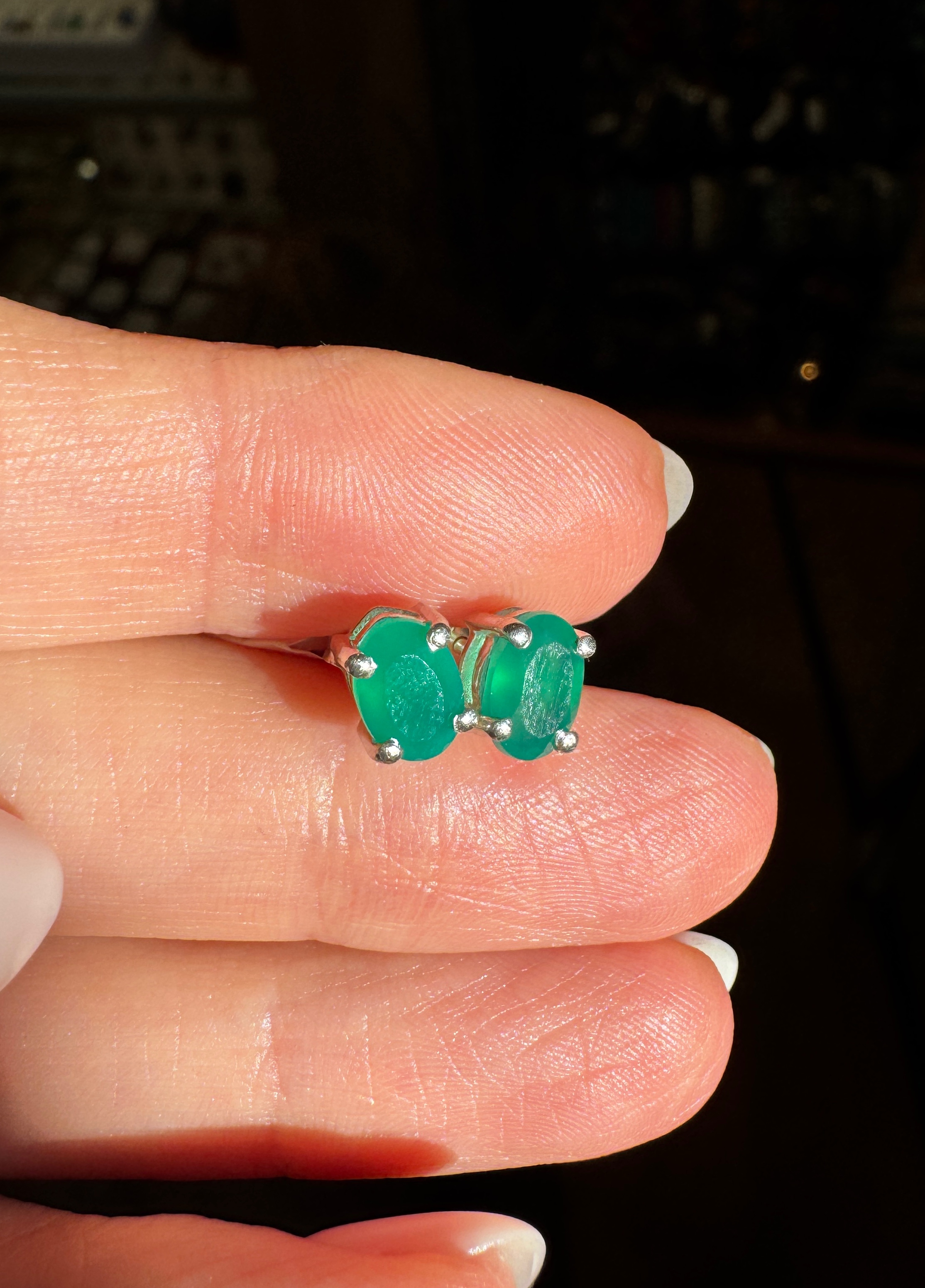 Ręcznie wykonane kolczyki wkrętki z zielonego fasetowanego onyksu w owalu oprawionego w srebro pr. 925