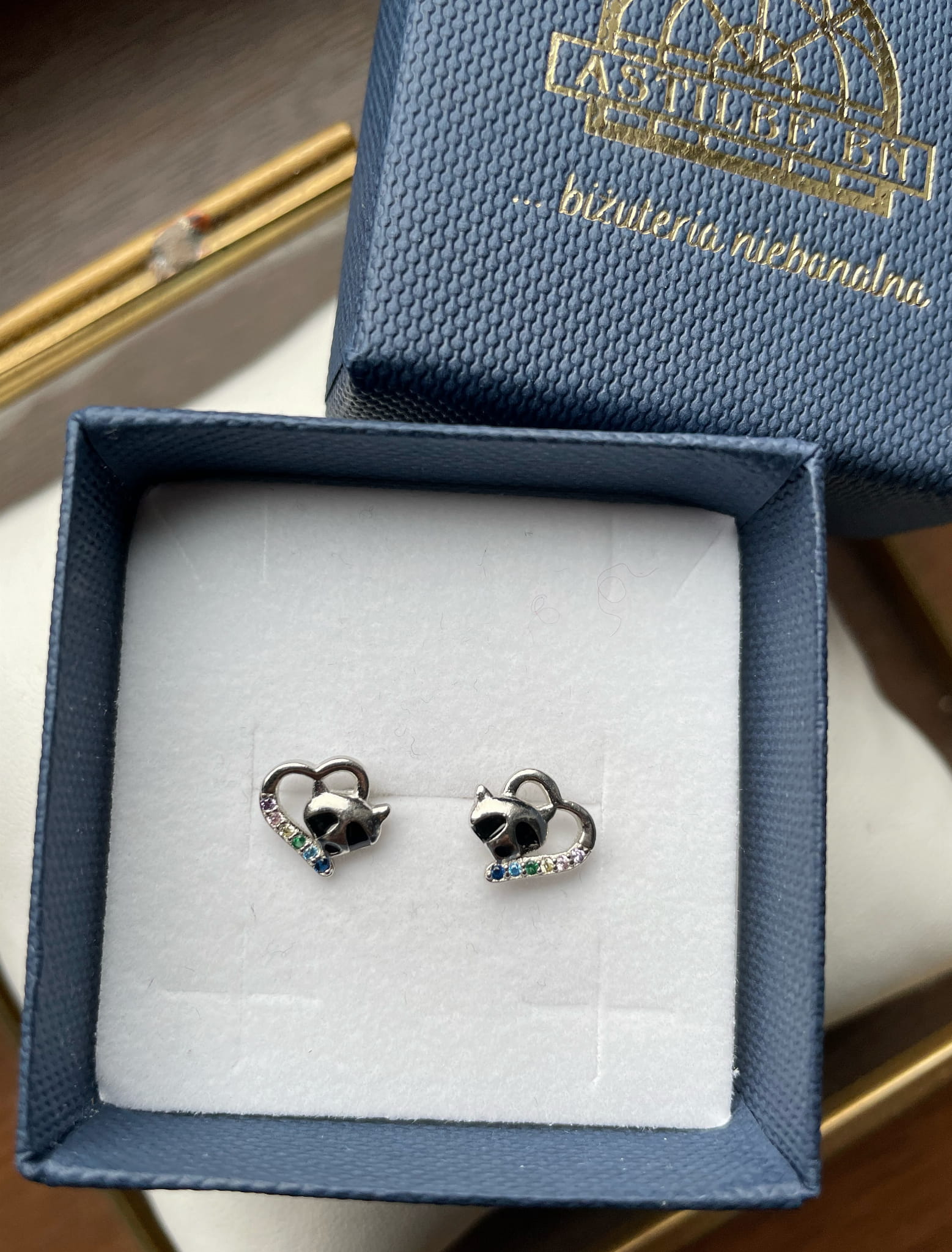 Kolczyki wkrętki z motywem szopa pracza ułożonego w kształt serca wykonane ze srebra pr. 925 i cyrkonii