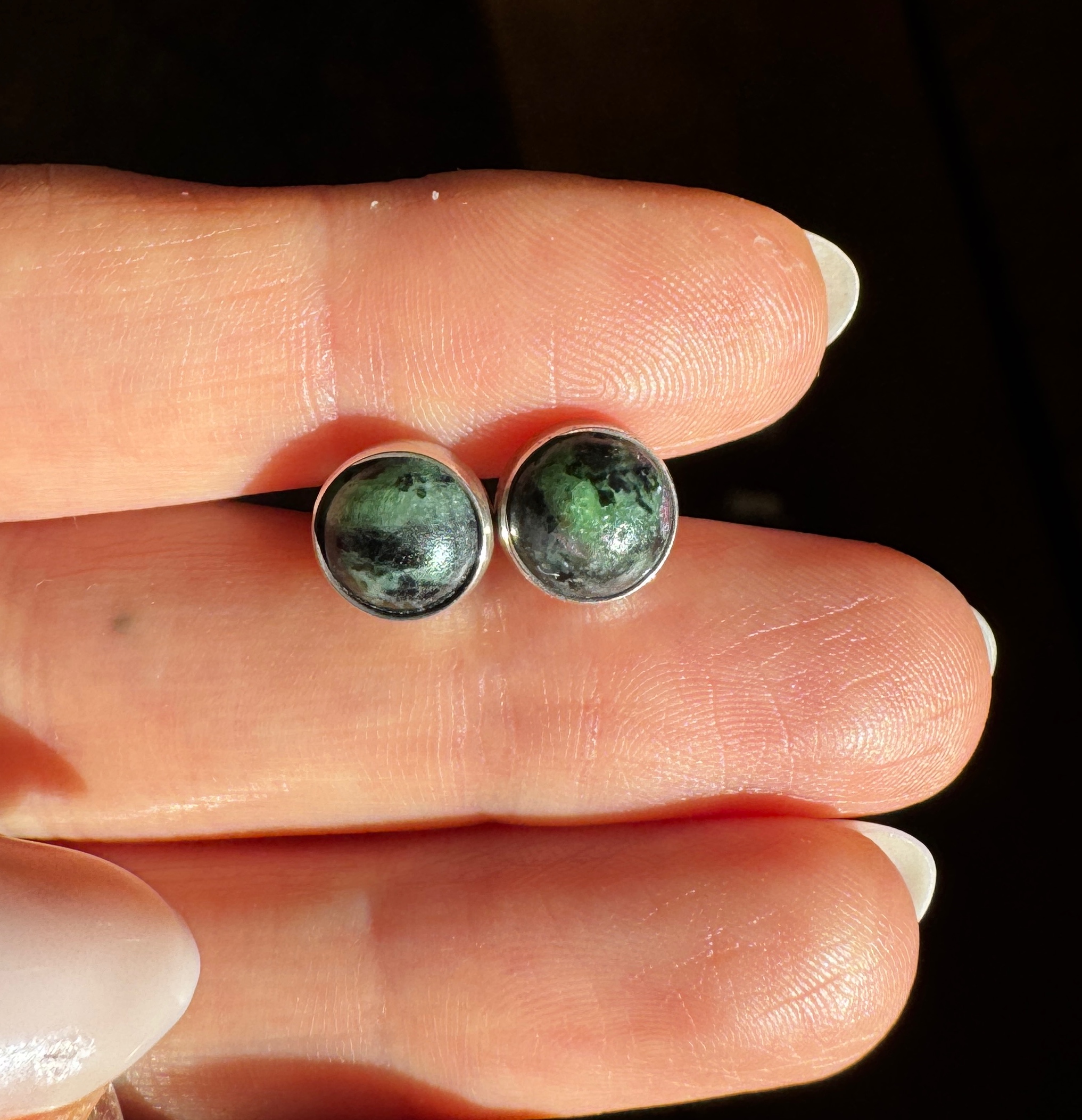 Ręcznie wykonane kolczyki wkrętki z zoisytu z rubinem o średnicy 8 mm oprawionego w srebro pr. 925