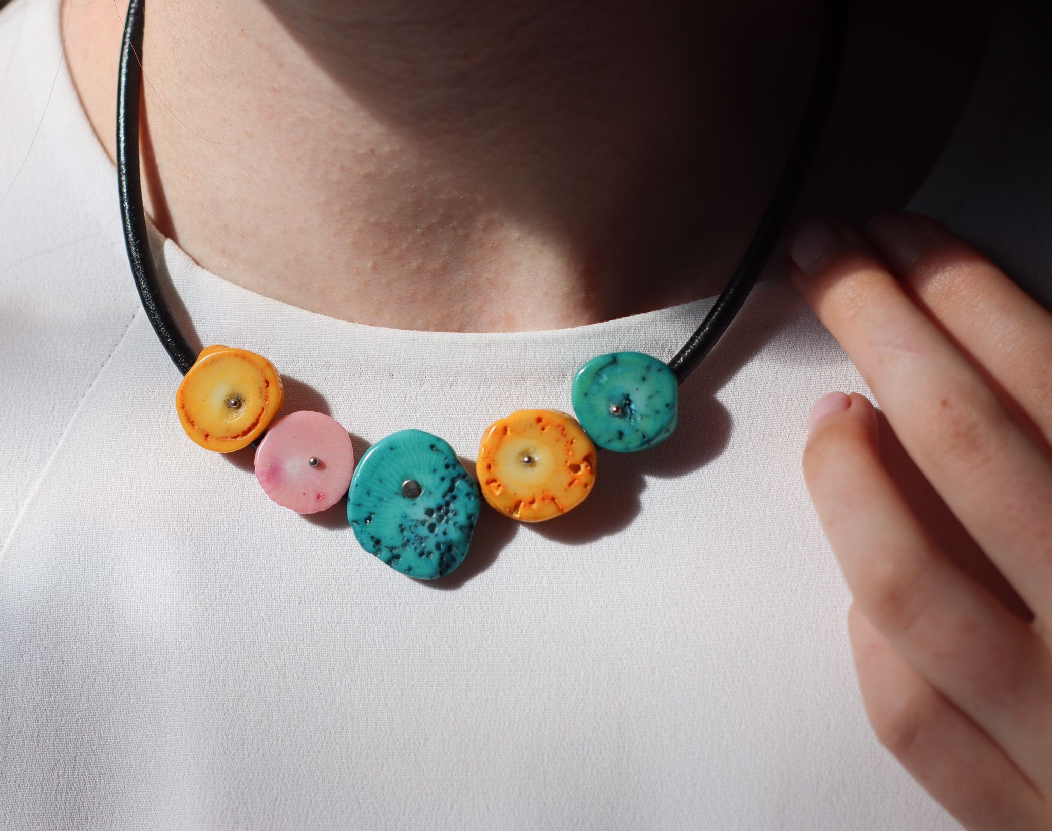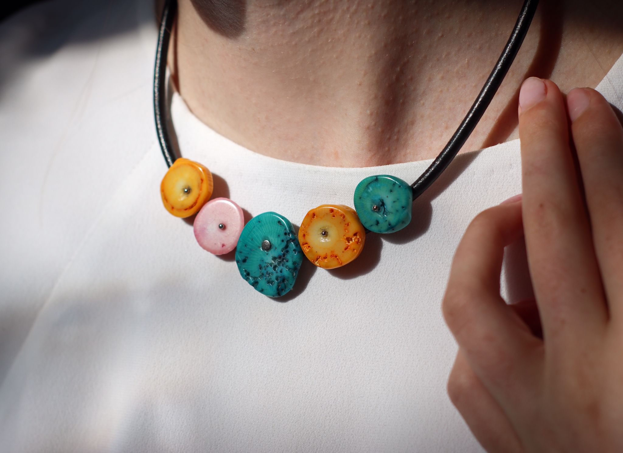 Naszyjnik Koralowe Plastry pastelowy wykonany z korala różowego, błękitnego i żółtego oraz srebra pr. 925 na rzemieniu w kolorze czarnym.