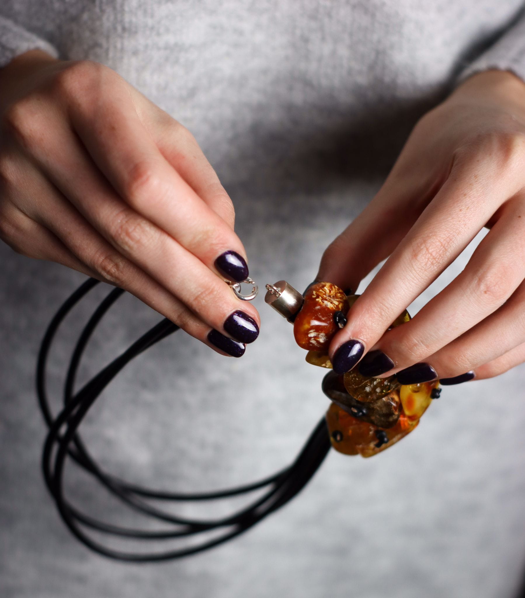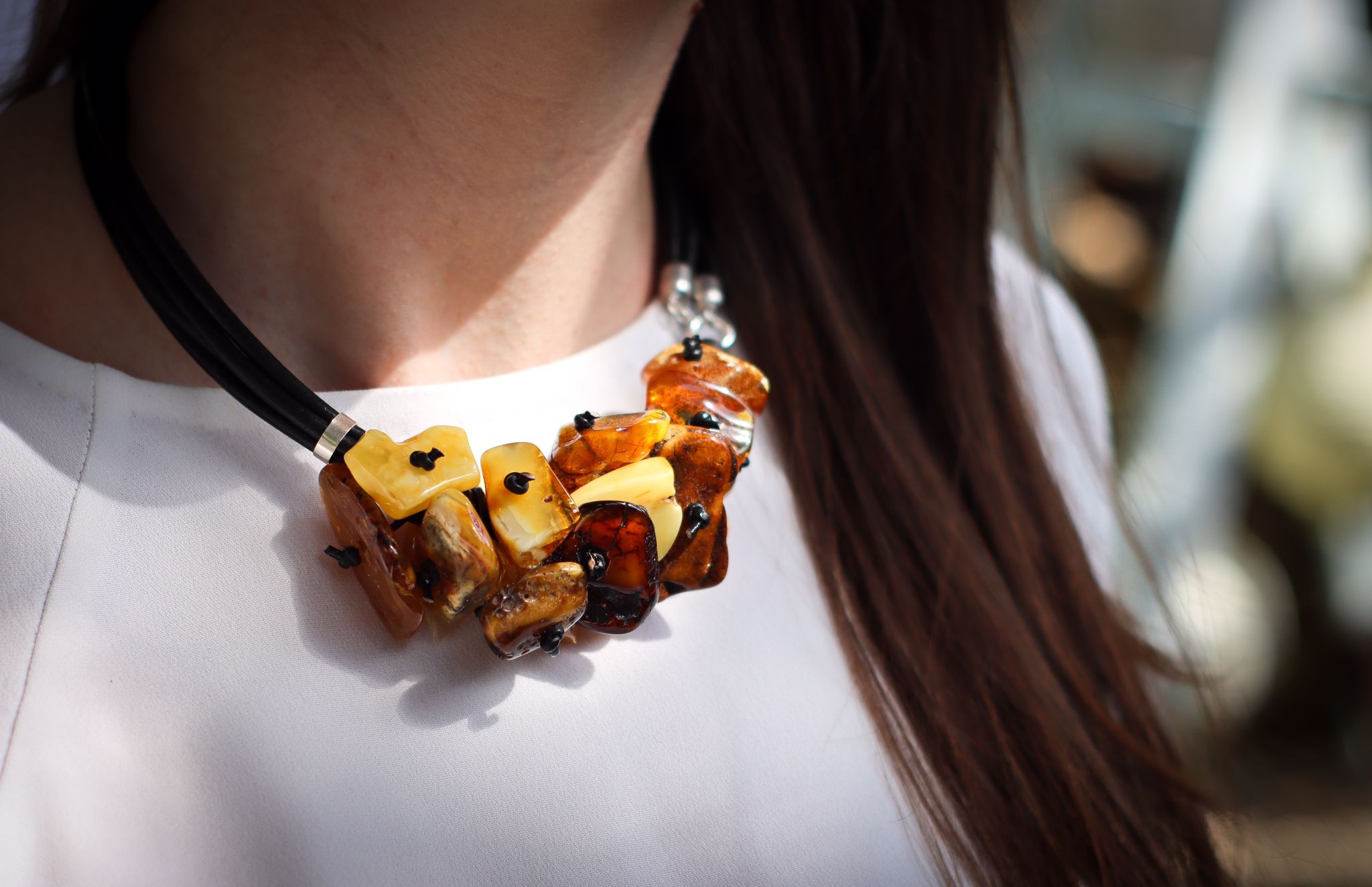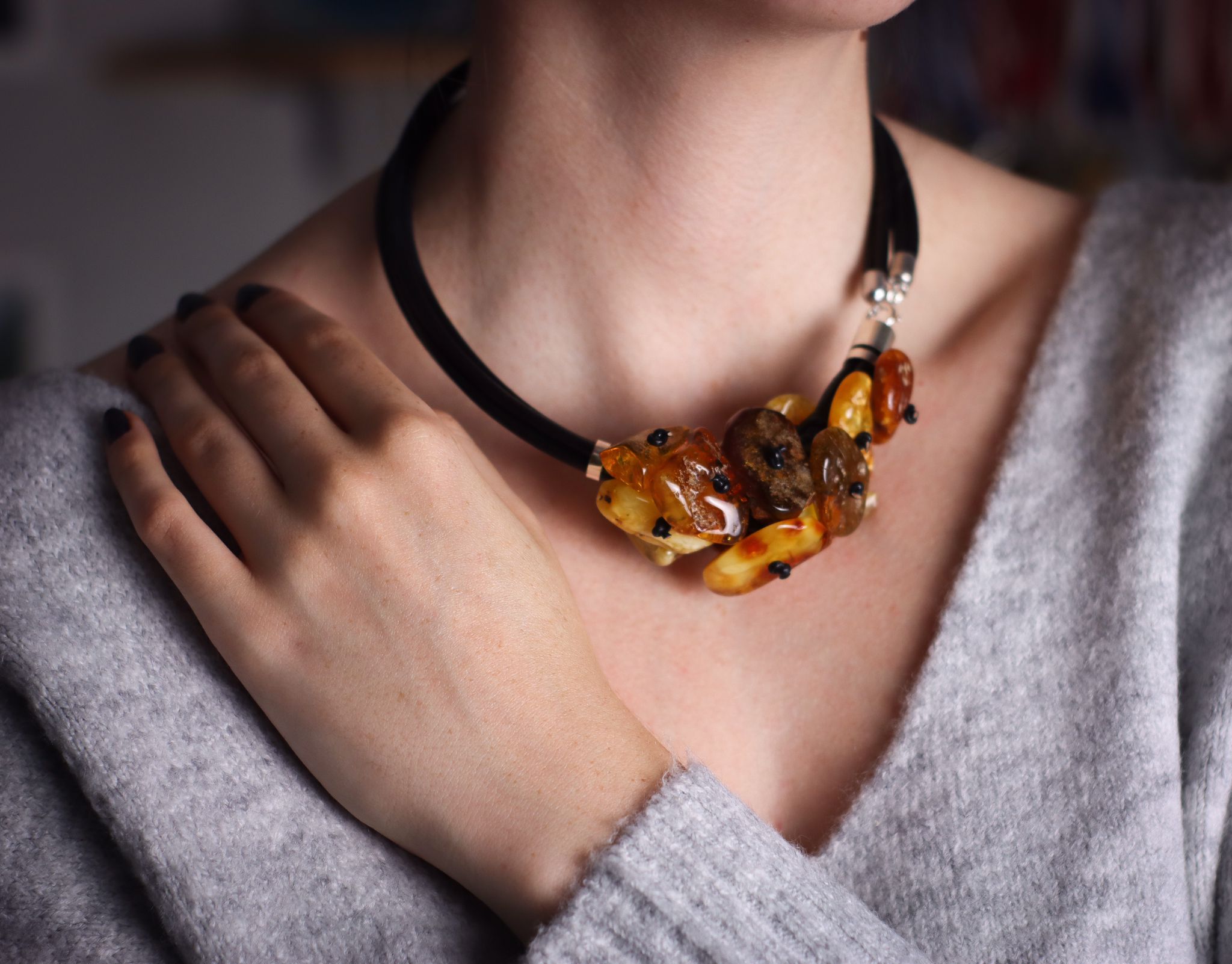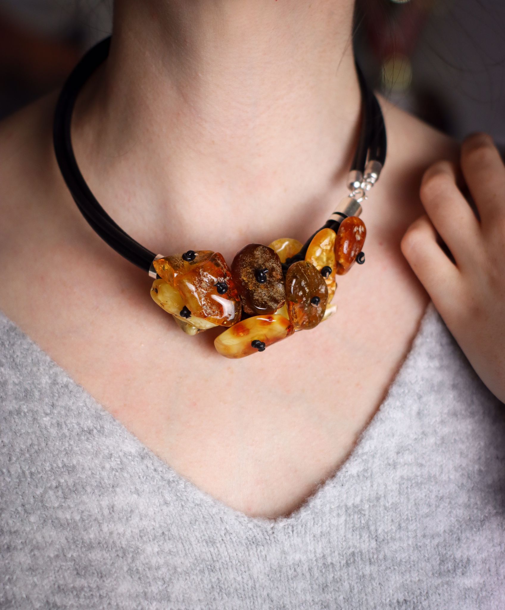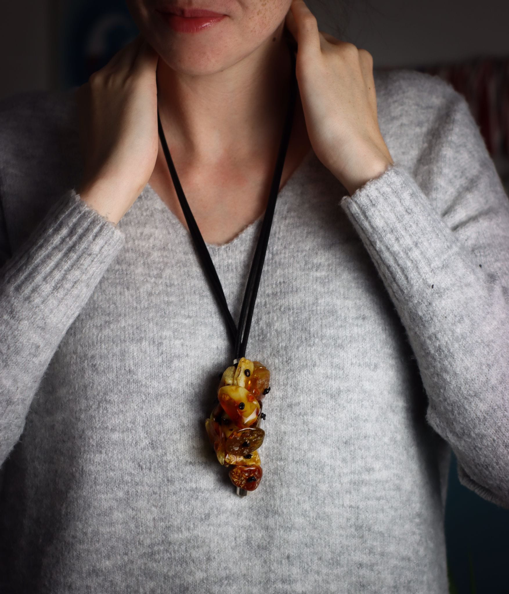 Piękny, ręcznie wykonany przez Karinę naszyjnik z naturalnych bursztynów, srebra i rzemienia do wyboru w kolorze czarnym lub brązowym. Możesz nosić go w wersji długiej lub krótkiej w zależności od Twojej stylizacji.