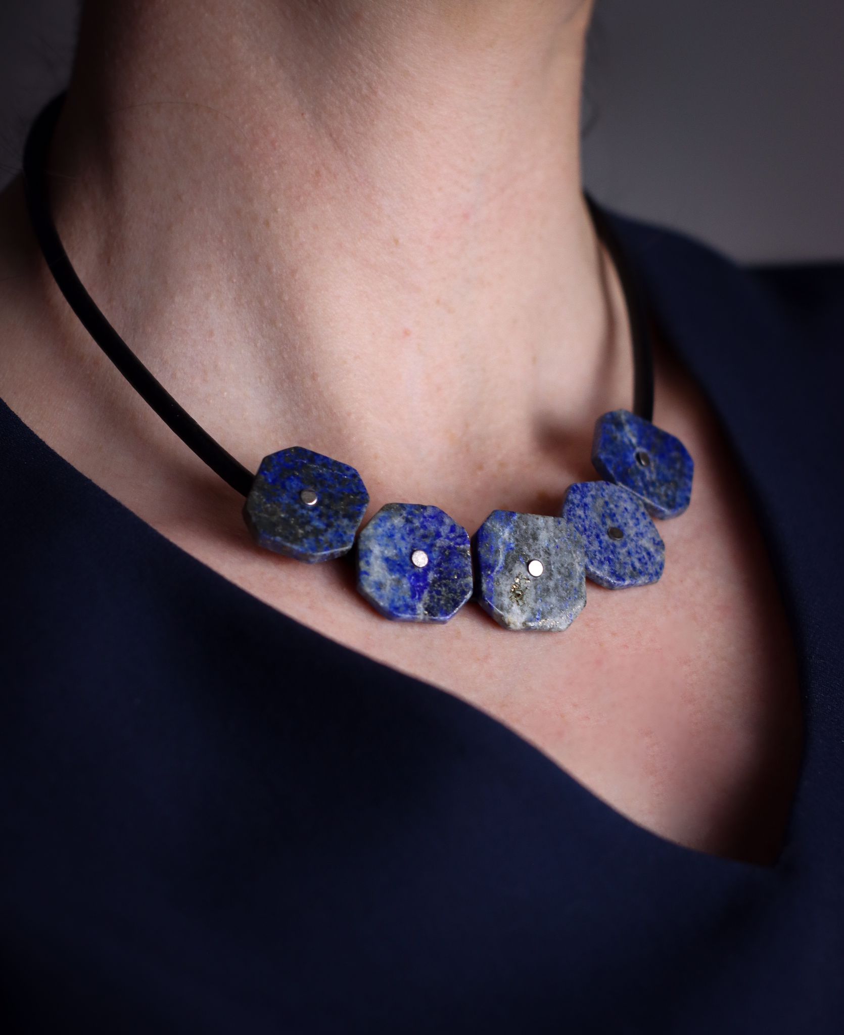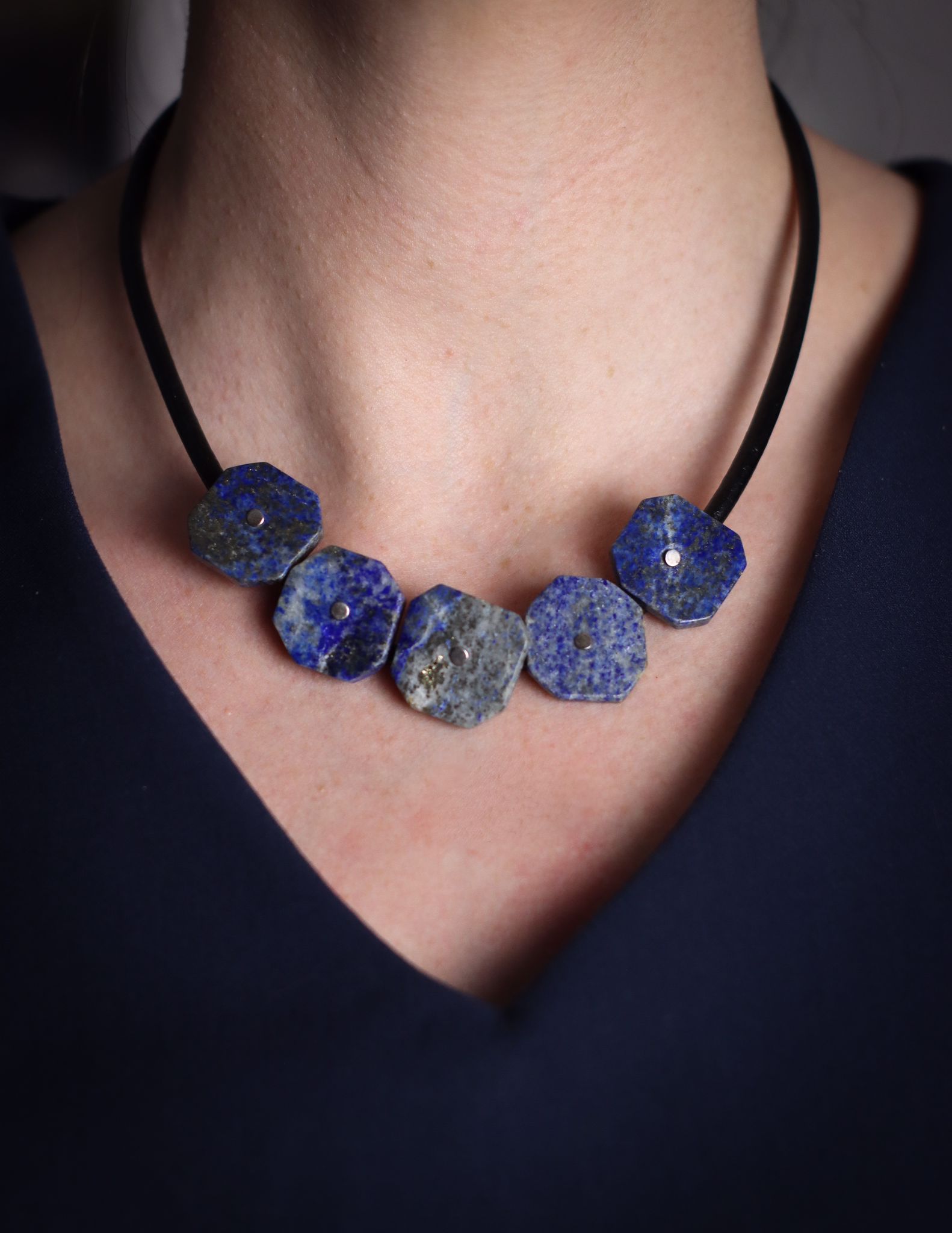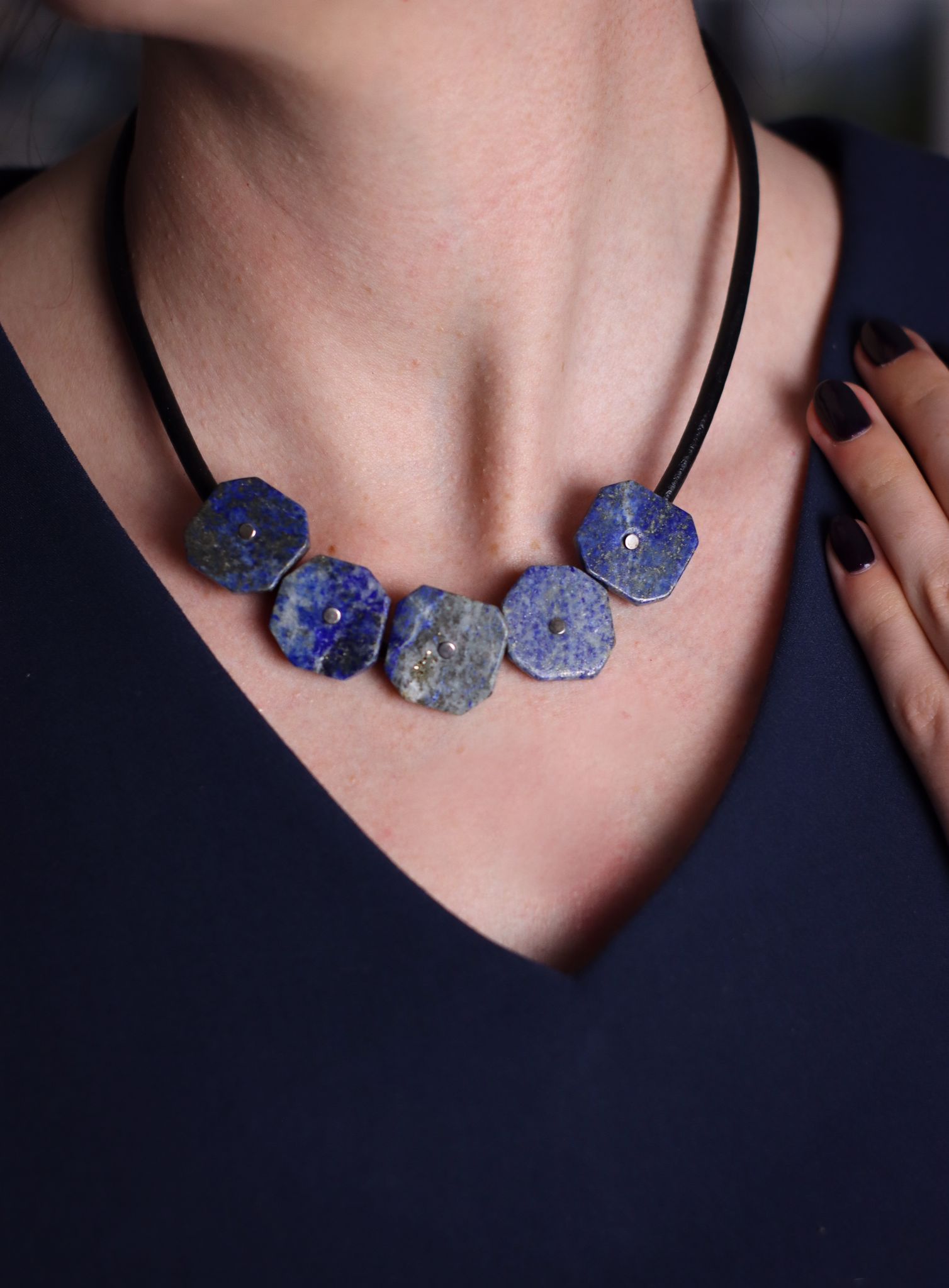 Ręcznie wykonany przez Magdę naszyjnik Lapisowe Plastry w niebieskim odcieniu oraz srebra pr. 925 na rzemieniu w kolorze czarnym.