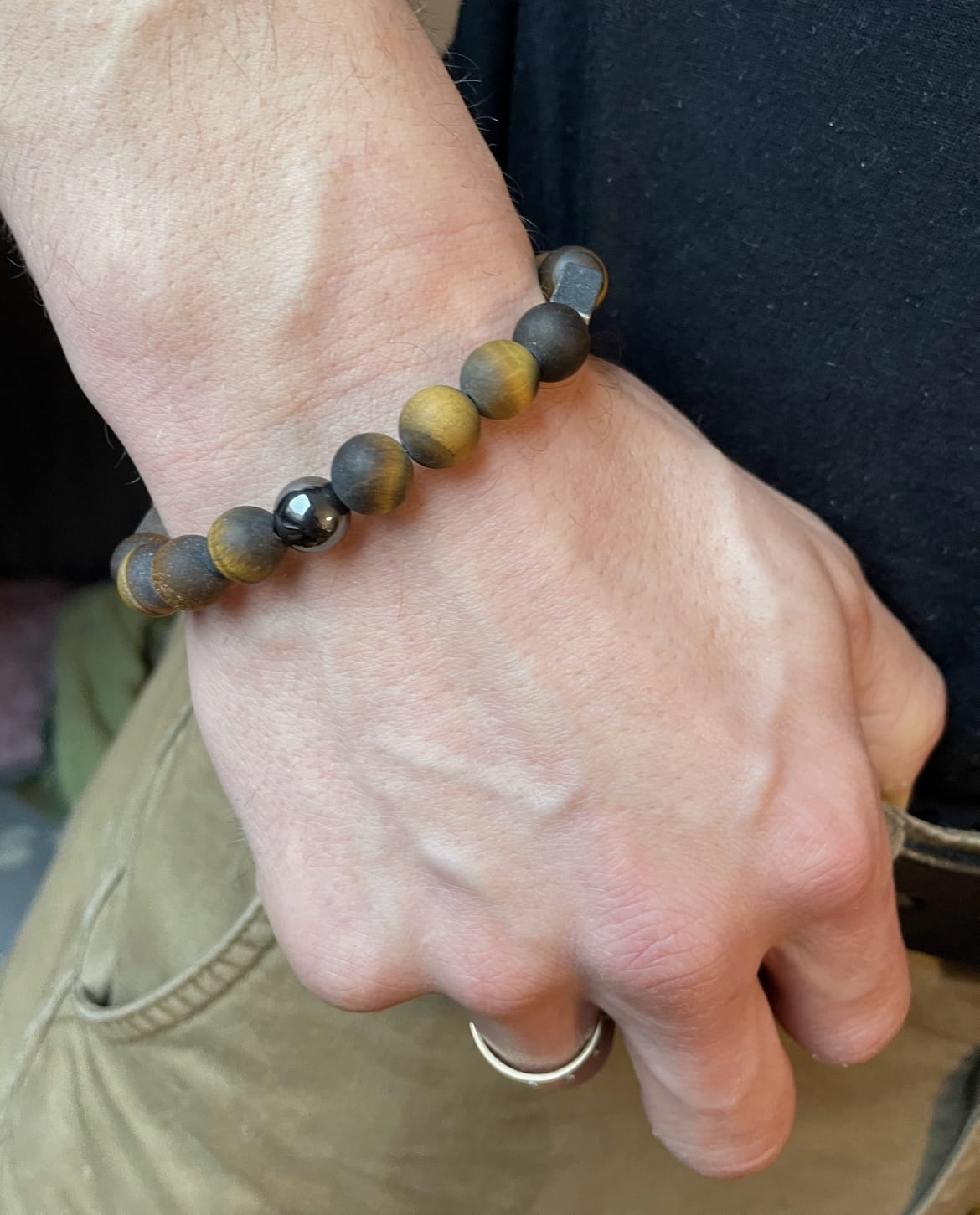 Ręcznie wykonana męska bransoletka z hematytów i matowego tygrysiego oka.