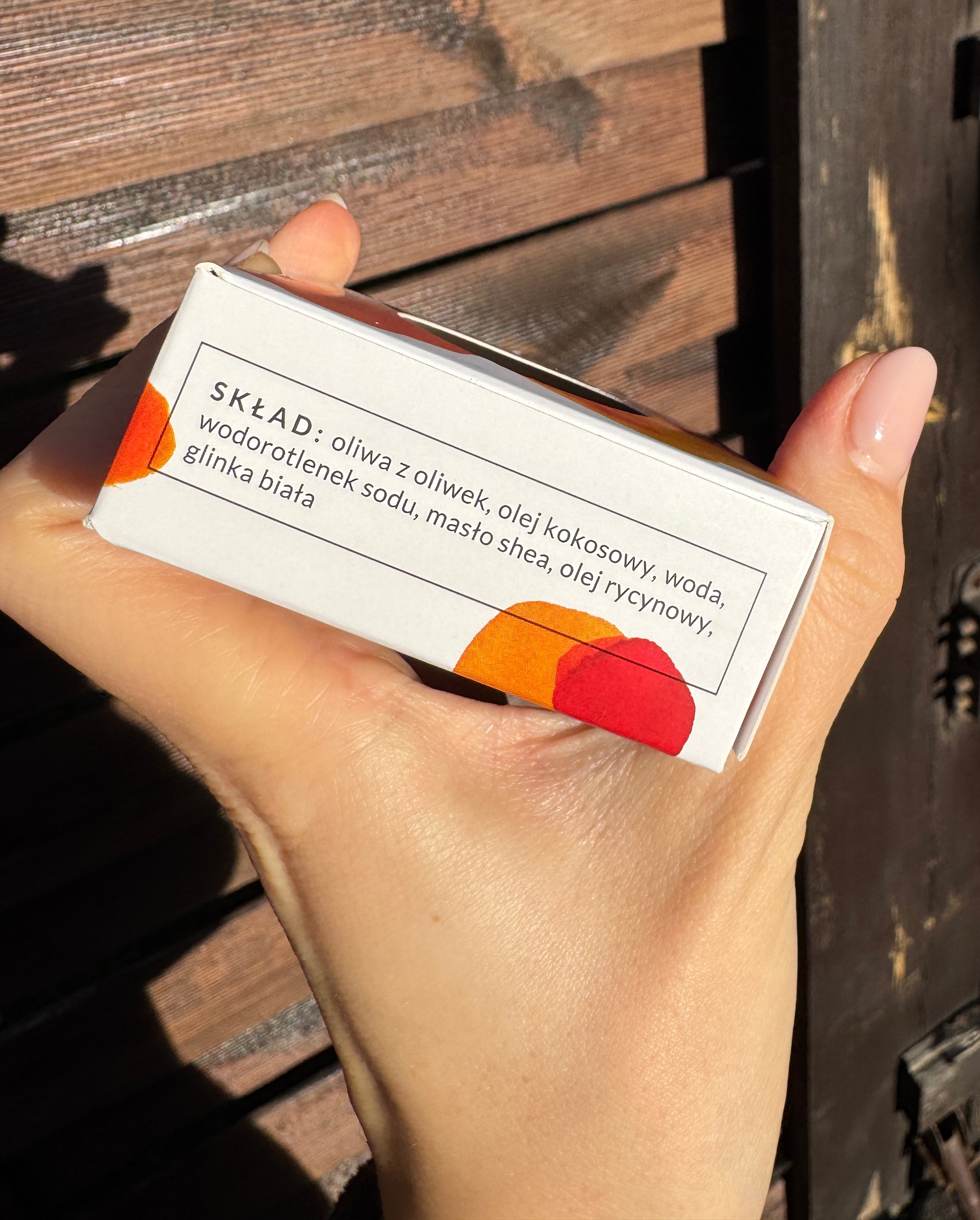 Oliwa z oliwek, Olej kokosowy, Woda, Wodorotlenek sodu, Masło Shea , Olej rycynowy, Glinka biała.