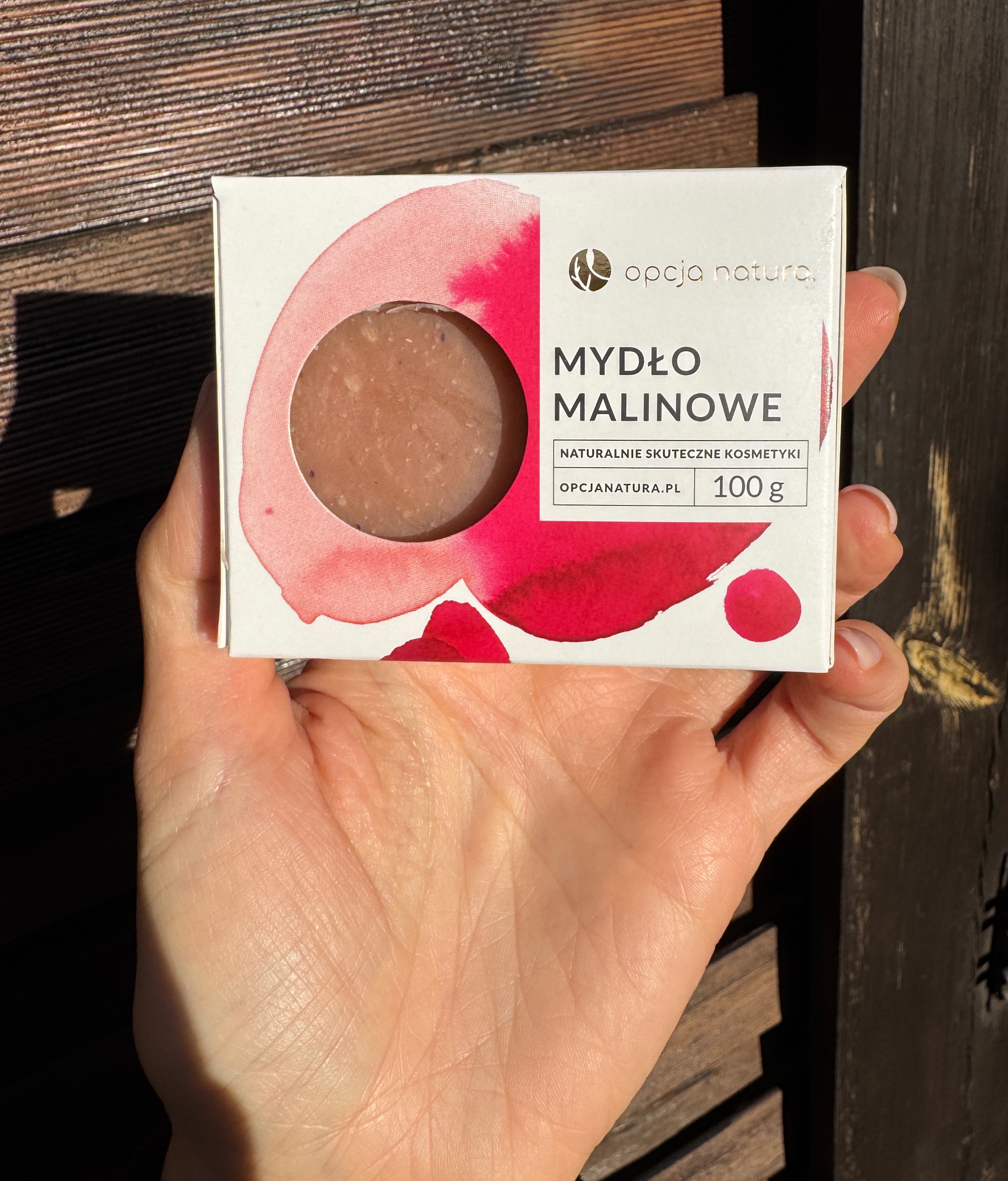 Klasyczne mydło polskiej marki Opcja Natura wytwarzanie ręcznie metodą na zimno o zapachu maliny.