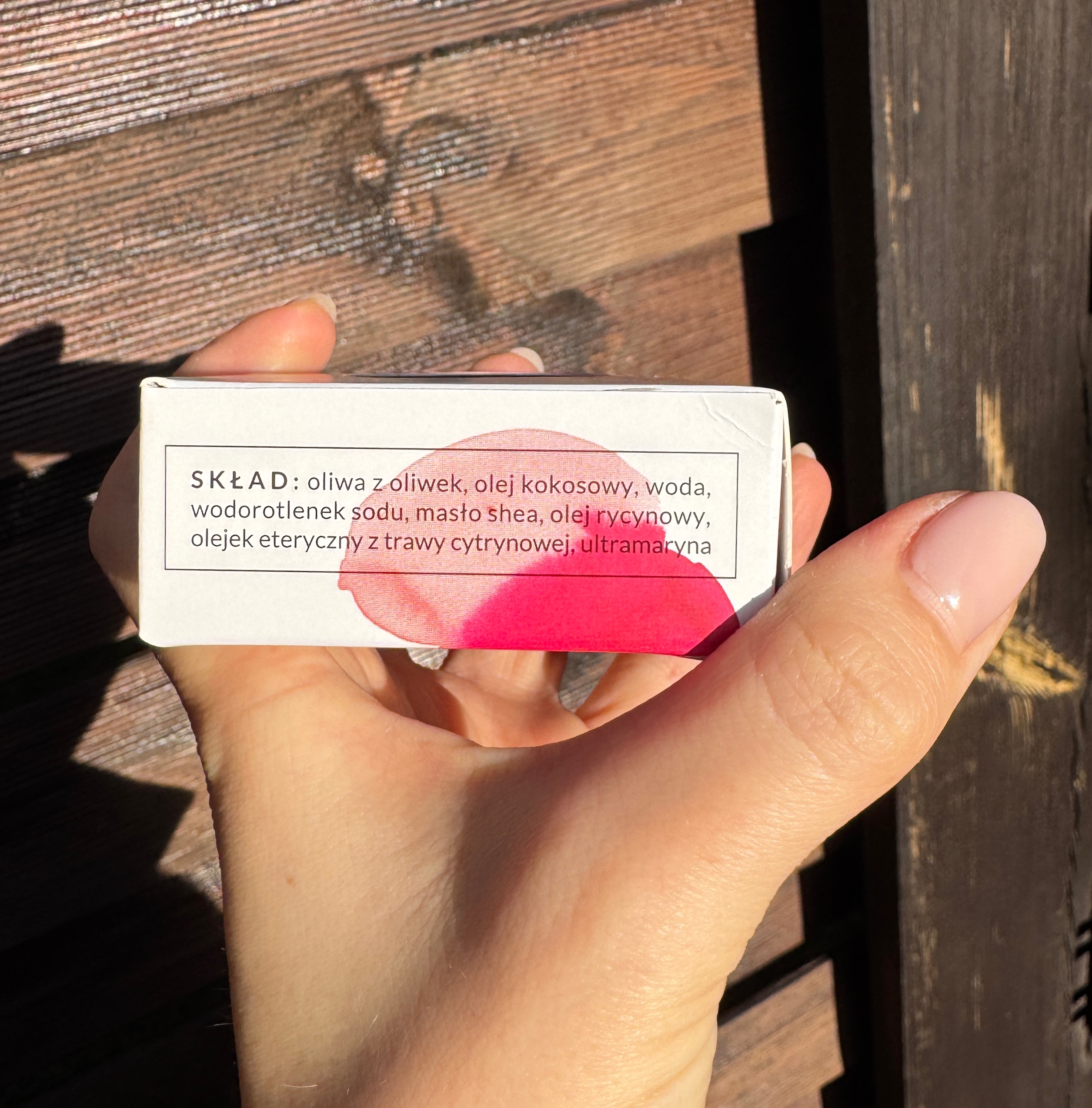 Oliwa z oliwek, Olej Kokosowy, Woda, Wodorotlenek Sodu, Masło Shea , Olej Rycynowy, Olejek Eteryczny May Chang, Ultramaryna.