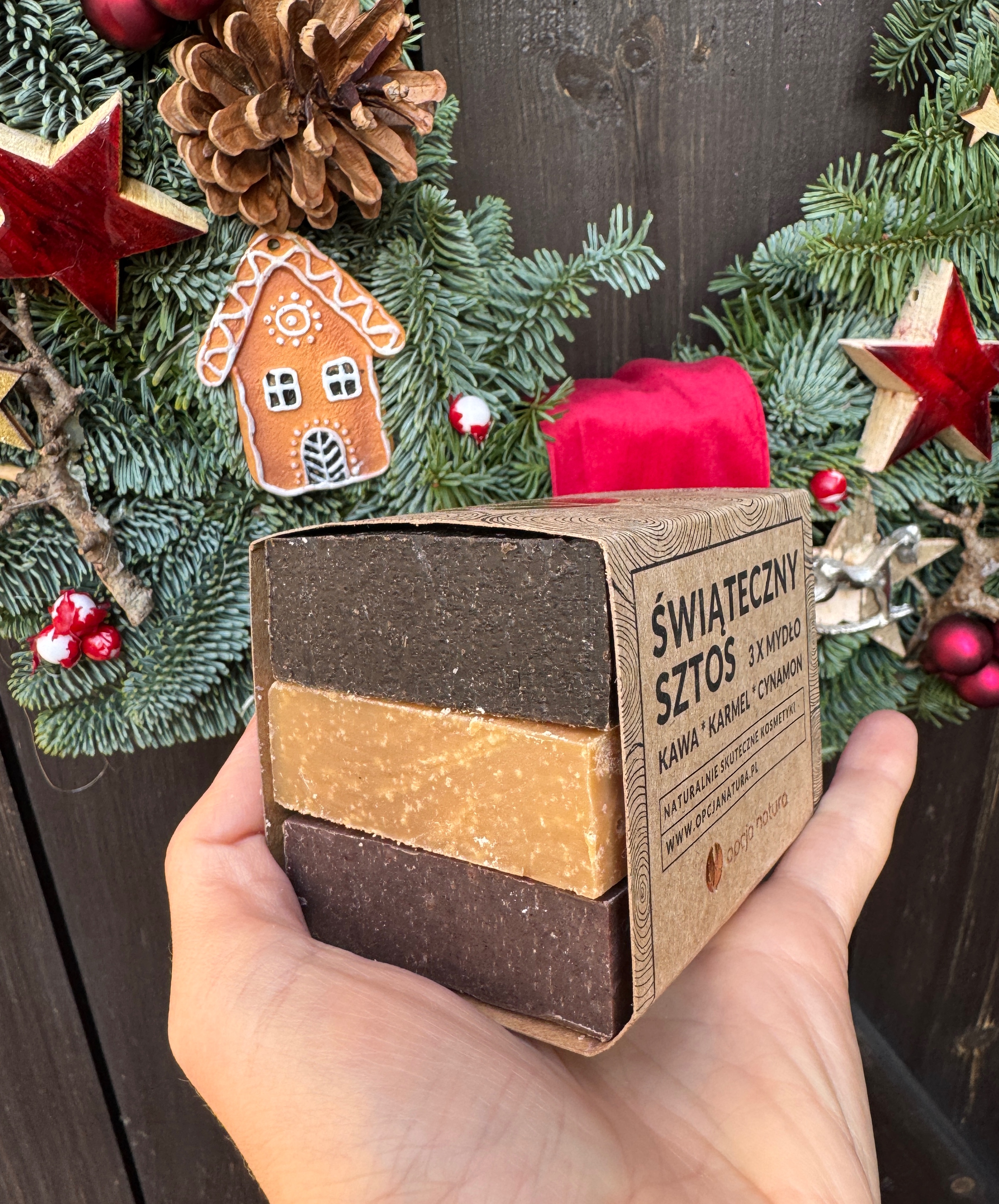 Klasyczne mydła polskiej marki Opcja Natura wytwarzanie ręcznie metodą na zimno o charakterystycznych, świątecznych zapachach. Mydło karmelowe na bazie miodu - dzięki temu to słodka nuta naszego zestawu. Z kolei bez egzotycznego cynamonu nie wyobrażamy sobie świąt - stąd ten pomysł na mydło. A skoro mamy już taki ciasteczkowy duet, to musi być też kawa. Ta z kolei idealnie dopieści każdego wielbiciela mydlanych peelingów.