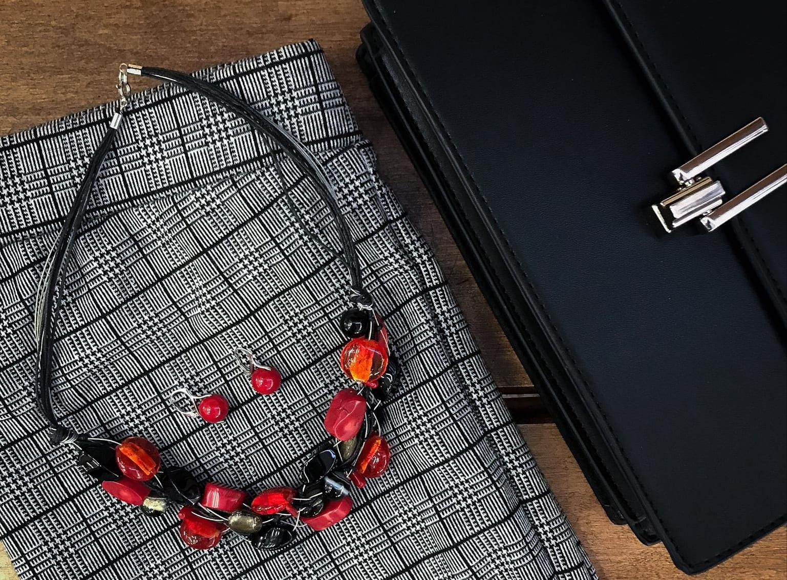 Naszyjnik wykonany z czerwonego korala, onyksu i szkła weneckiego.