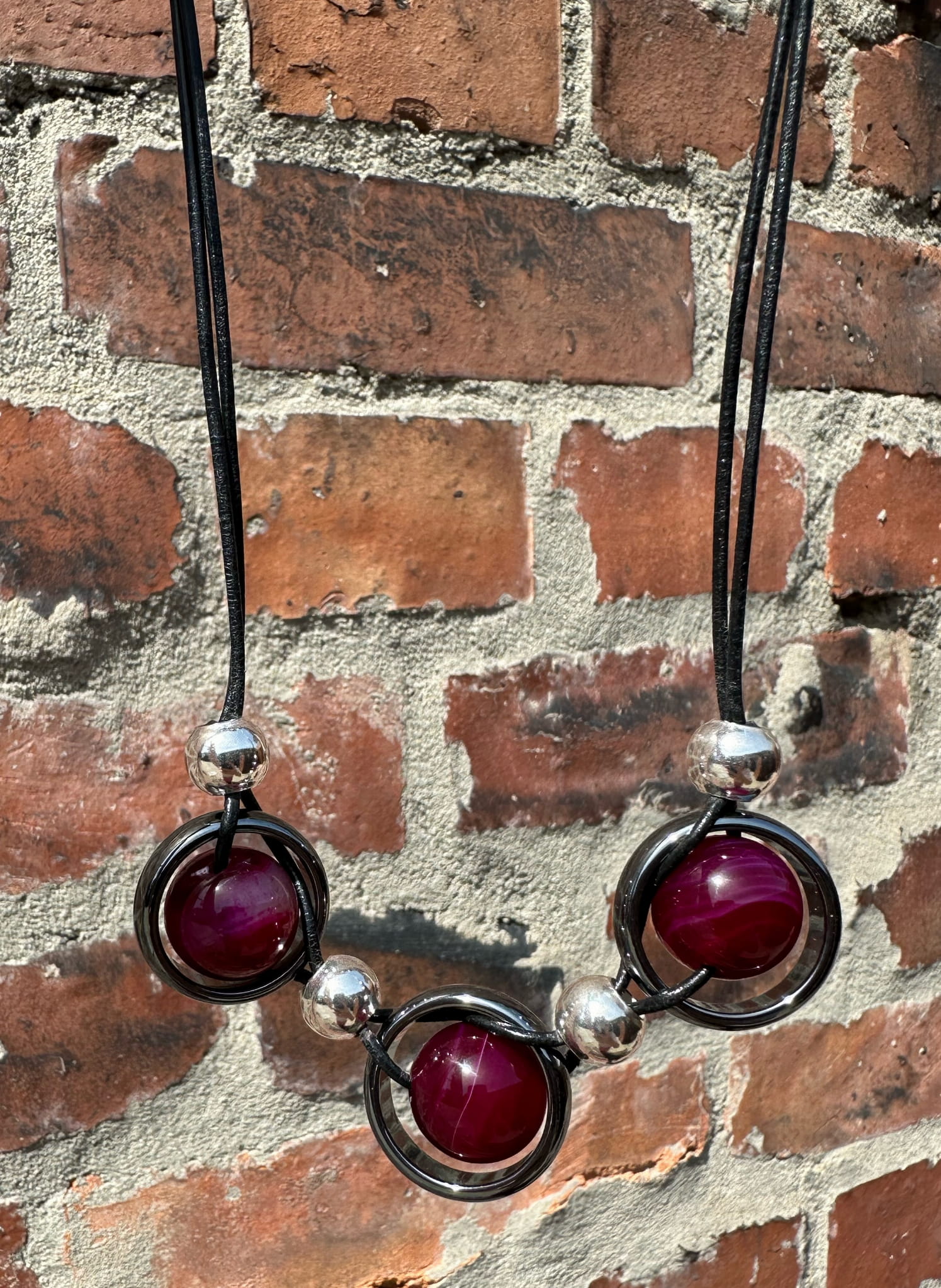 Naszyjnik wykonany z agatu szarego, hematytu, srebra pr. 925 i rzemienia w kolorze czarnym.