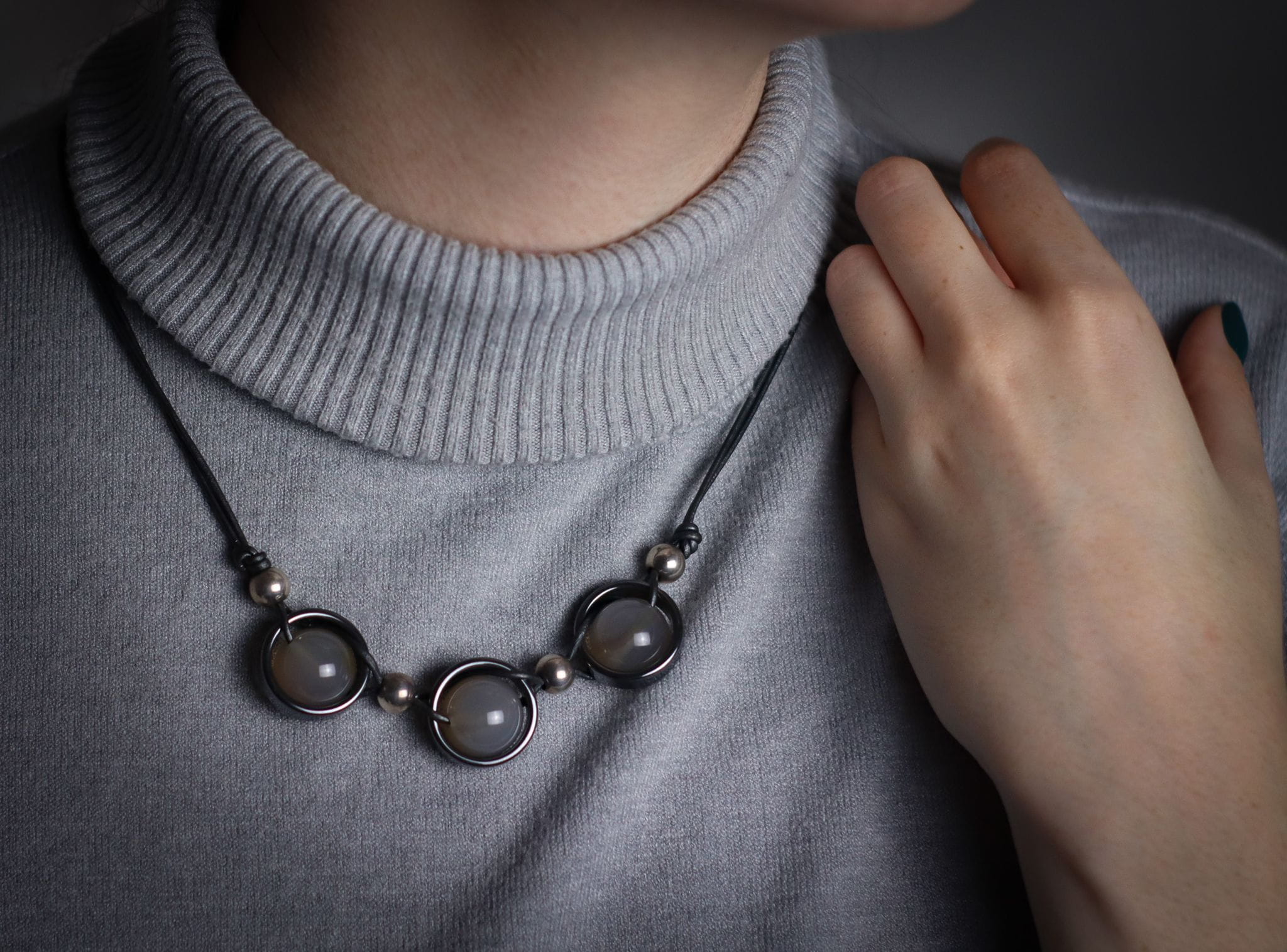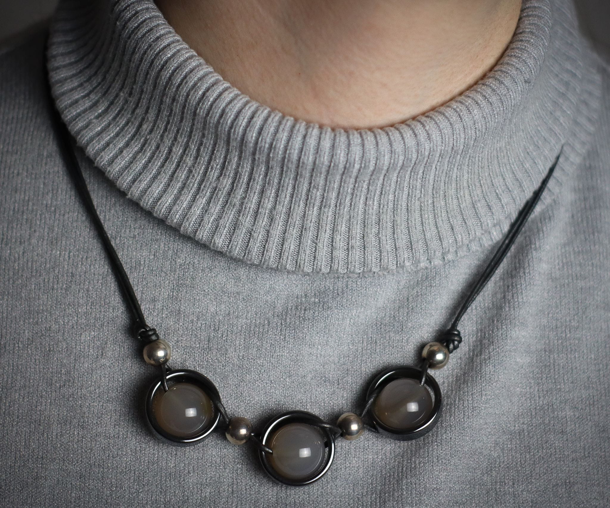 Naszyjnik wykonany z agatu szarego, hematytu, srebra pr. 925 i rzemienia w kolorze srebrnym.