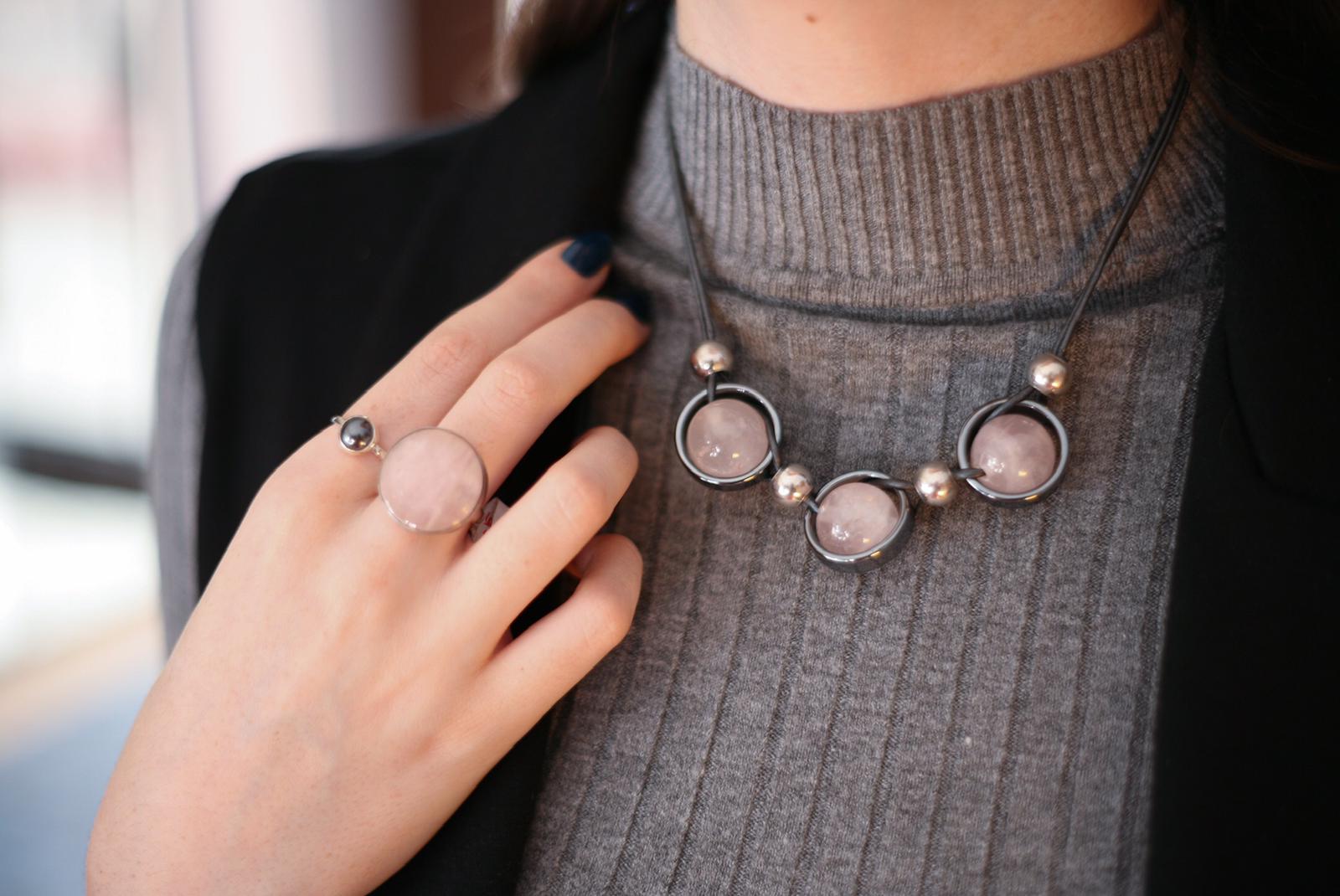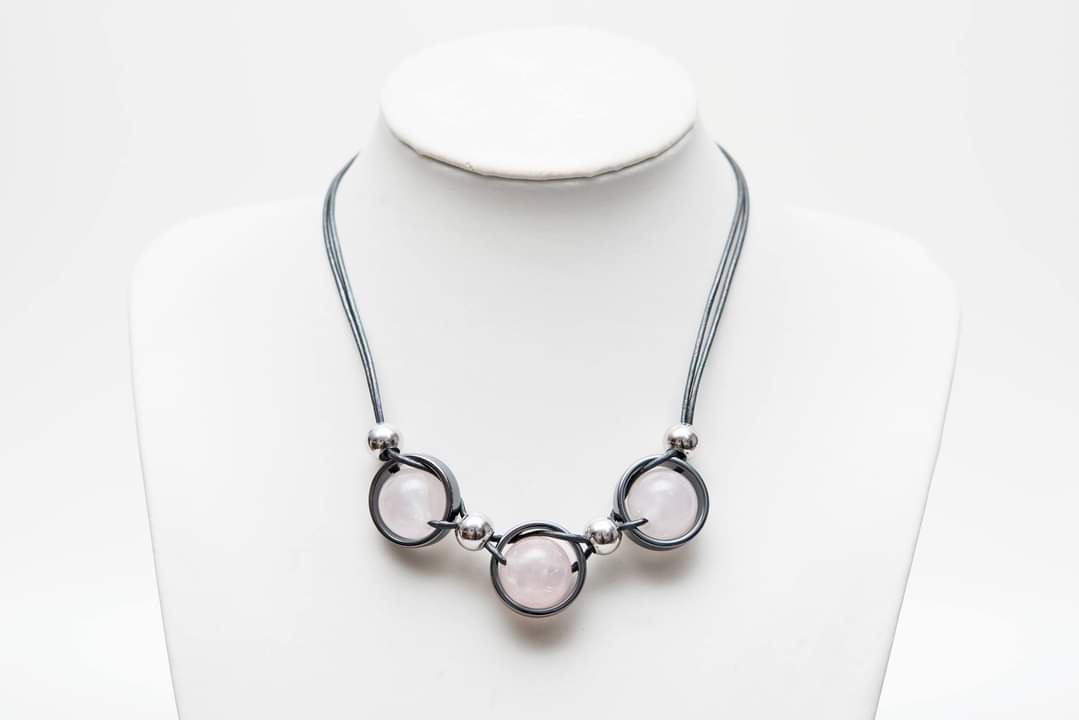 Naszyjnik wykonany z kwarcu różowego, hematytu, srebra pr. 925 i rzemienia w kolorze srebrnym.