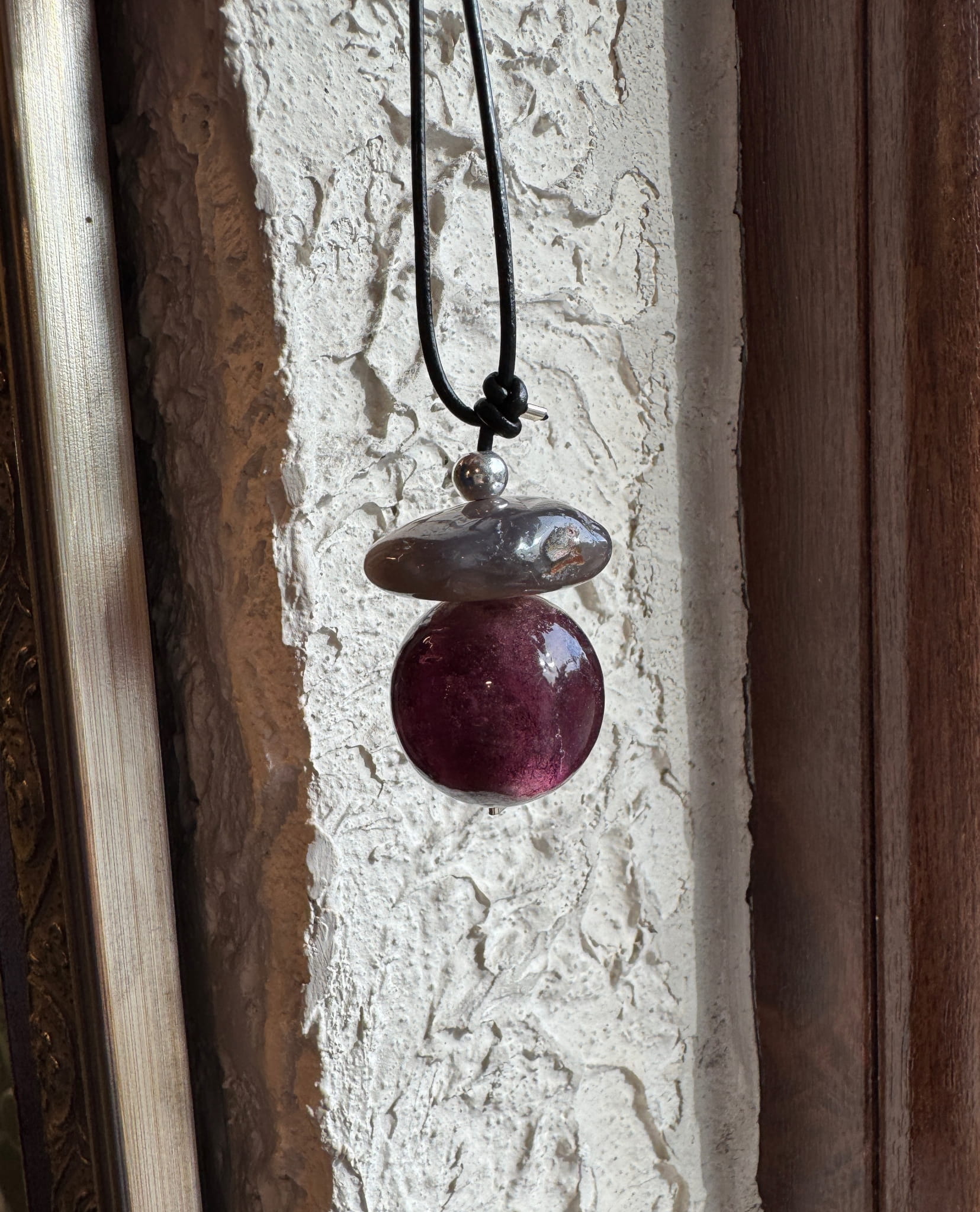 Ręcznie tworzony, długi naszyjnik Frezja, wisior wykonany z szarego agatu, fioletowego szkła weneckiego, srebra i czarnego rzemienia.