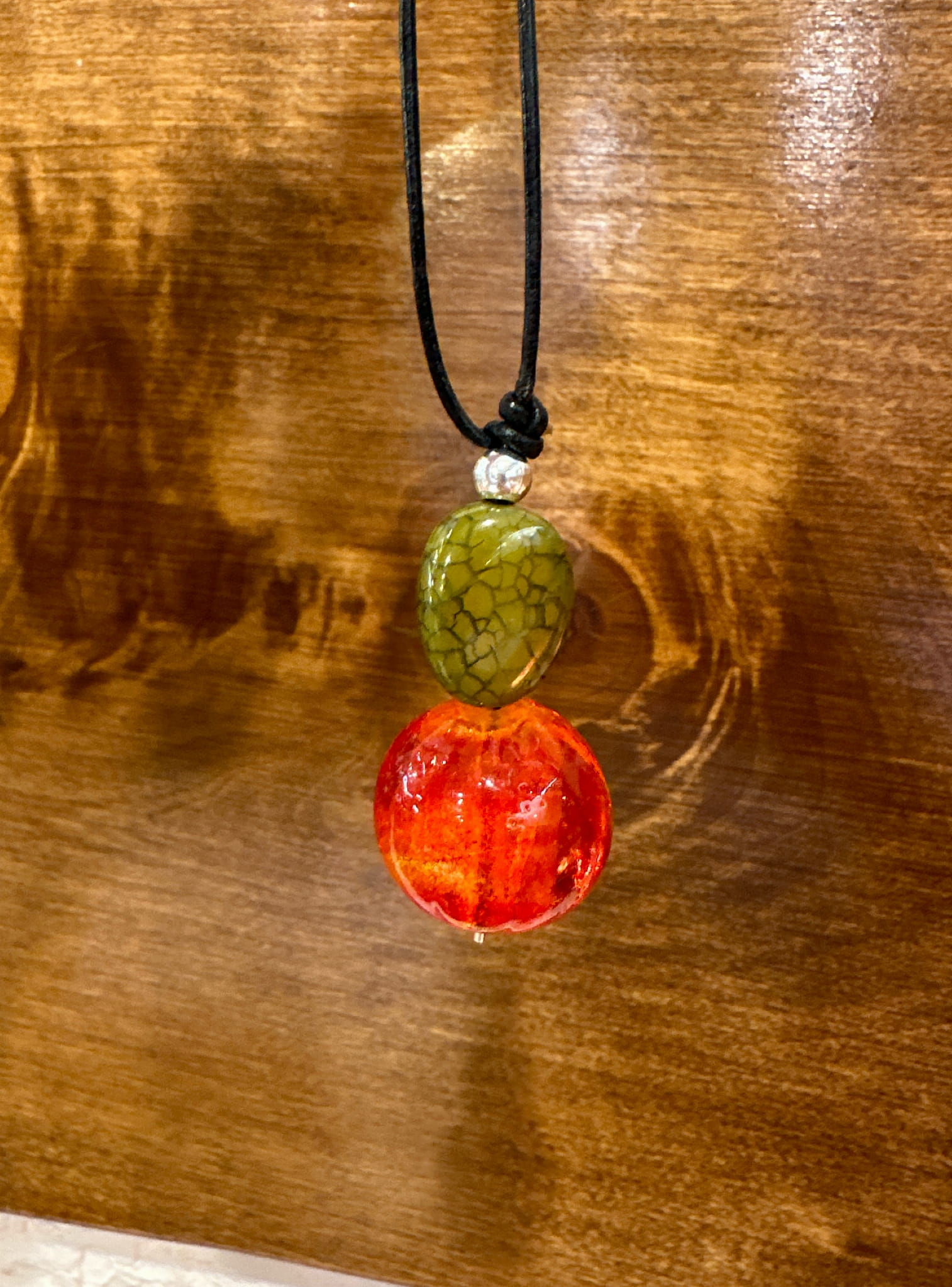 Ręcznie tworzony, długi naszyjnik Frezja, wisior wykonany z zielonego agatu smoczego, pomarańczowego szkła weneckiego, srebra i czarnego rzemienia.