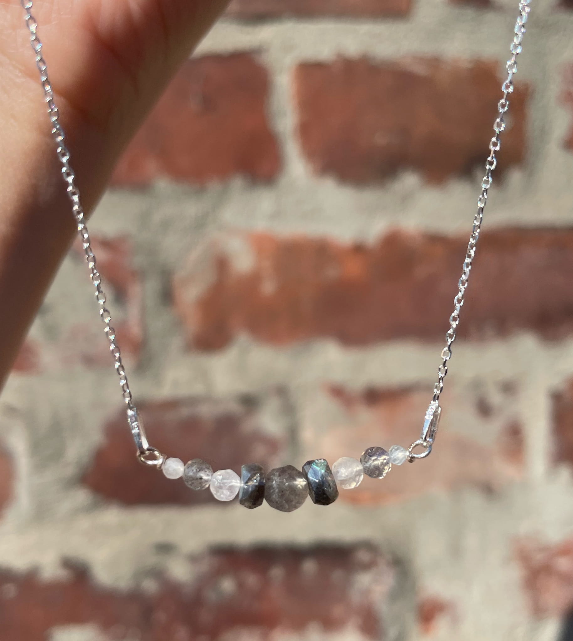 Ręcznie wykonany delikatny naszyjnik Frida ze srebra pr.925 drobnych fasetowanych kamieni księżycowych i labradorytów