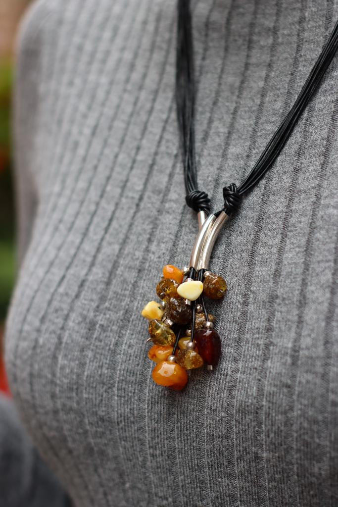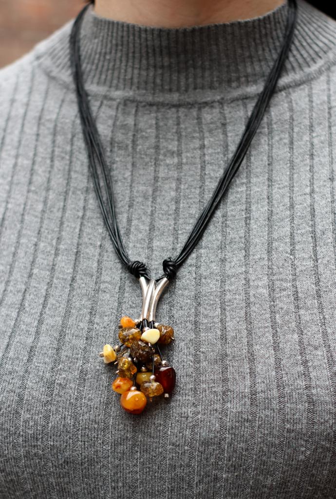 Piękny naszyjnik Grono Exclusive wykonany z naturalnych bryłek bursztynu srebra pr.925 oraz rzemienia w czarnym kolorze.