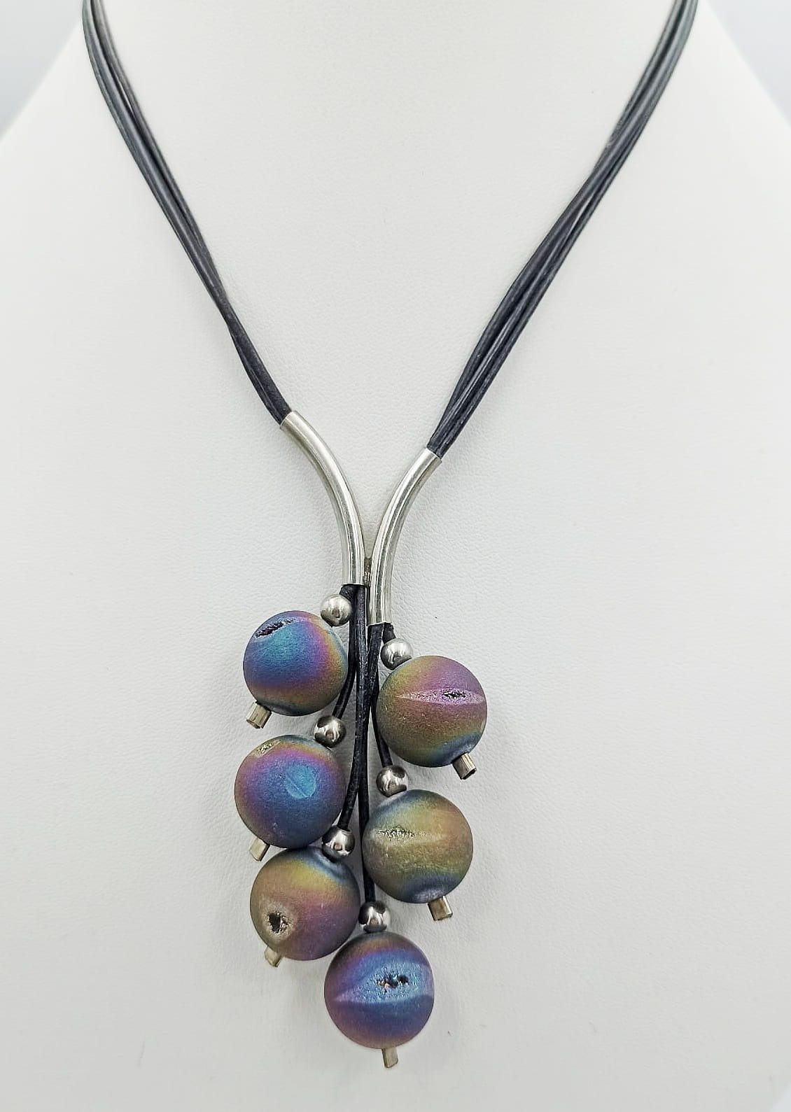 Naszyjnik Grono ręcznie wykonany z kul kolorowego agatu tytanowego, srebra pr.925 oraz rzemienia w czarnym kolorze.