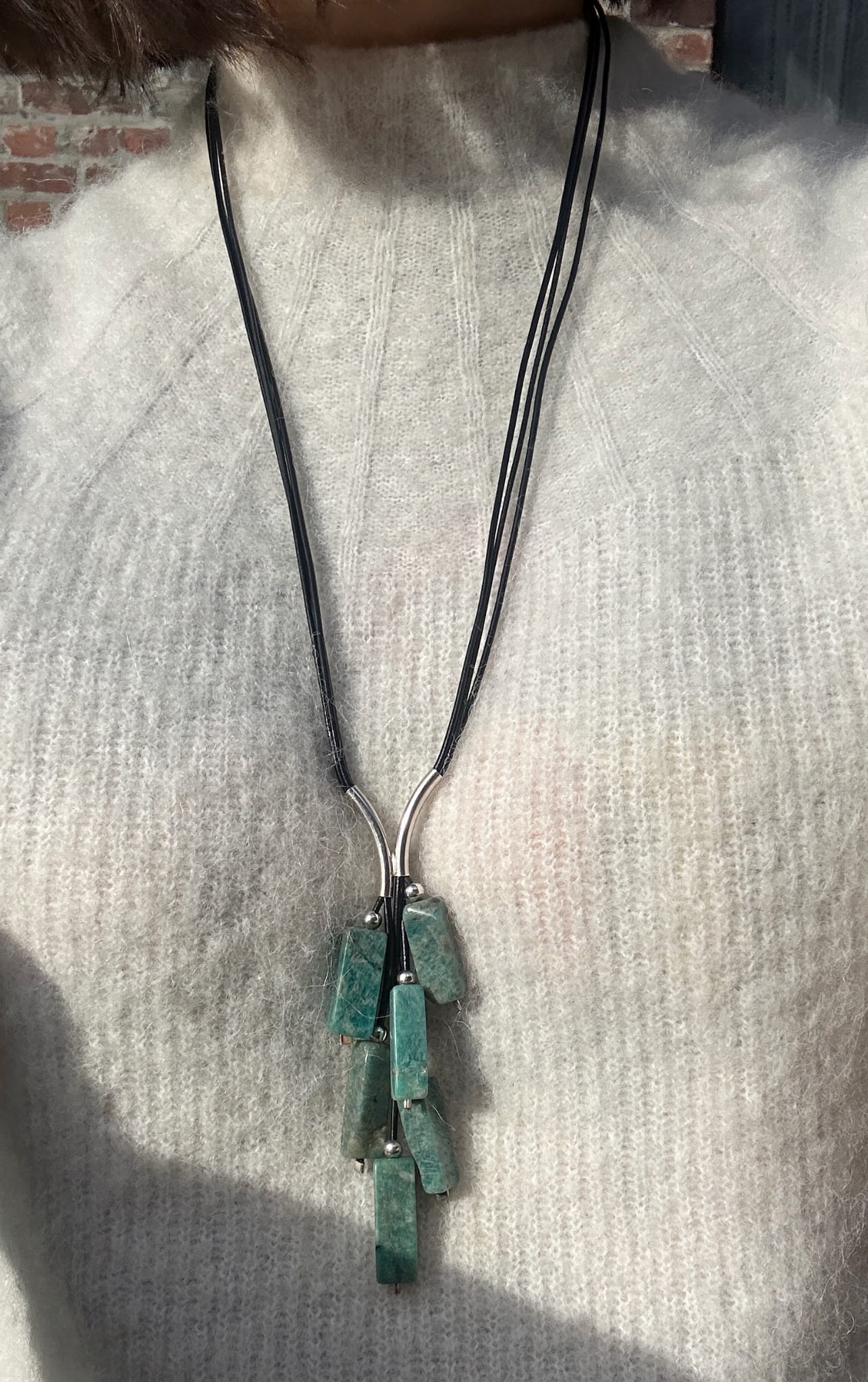 Naszyjnik Grono wykonany z podłużnego amazonitu, srebra pr.925 oraz rzemienia w kolorze czarnym