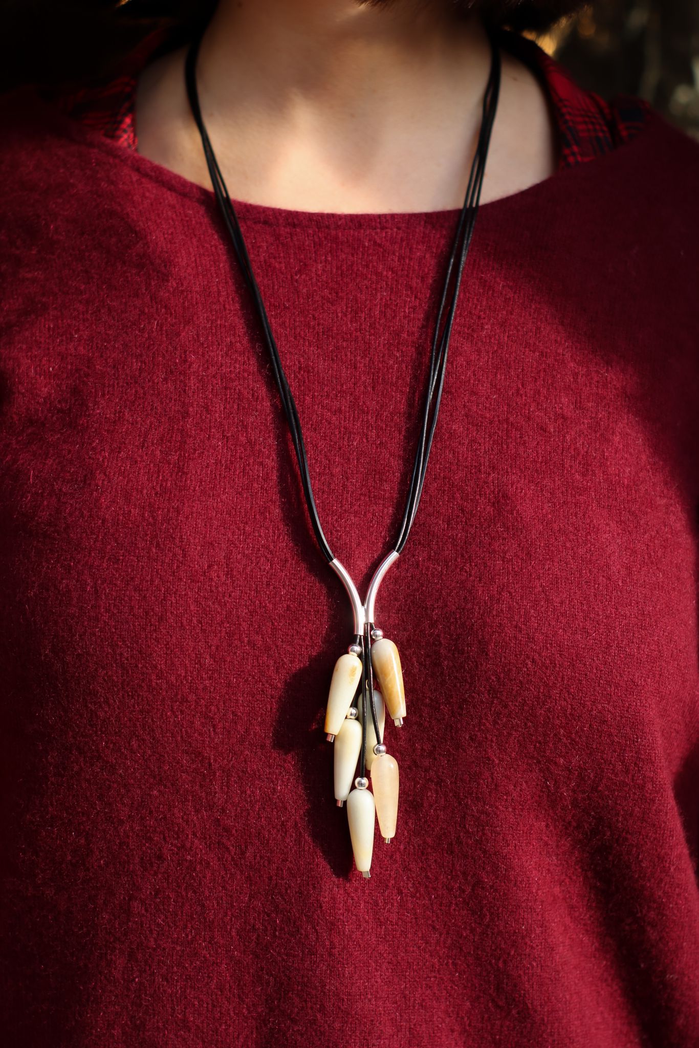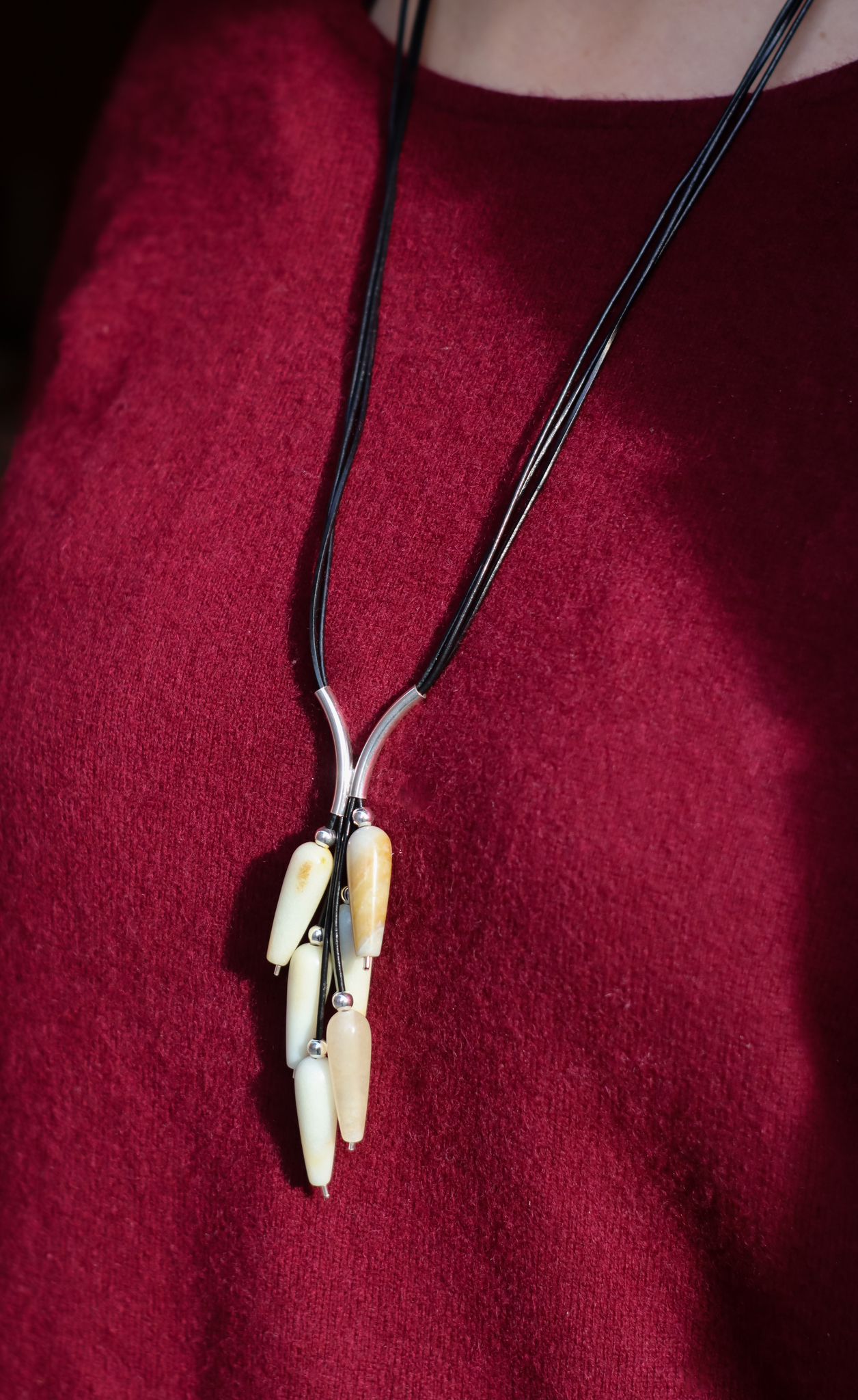 Naszyjnik Grono wykonany z podłużnego amazonitu, srebra pr.925 oraz rzemienia w kolorze czarnym