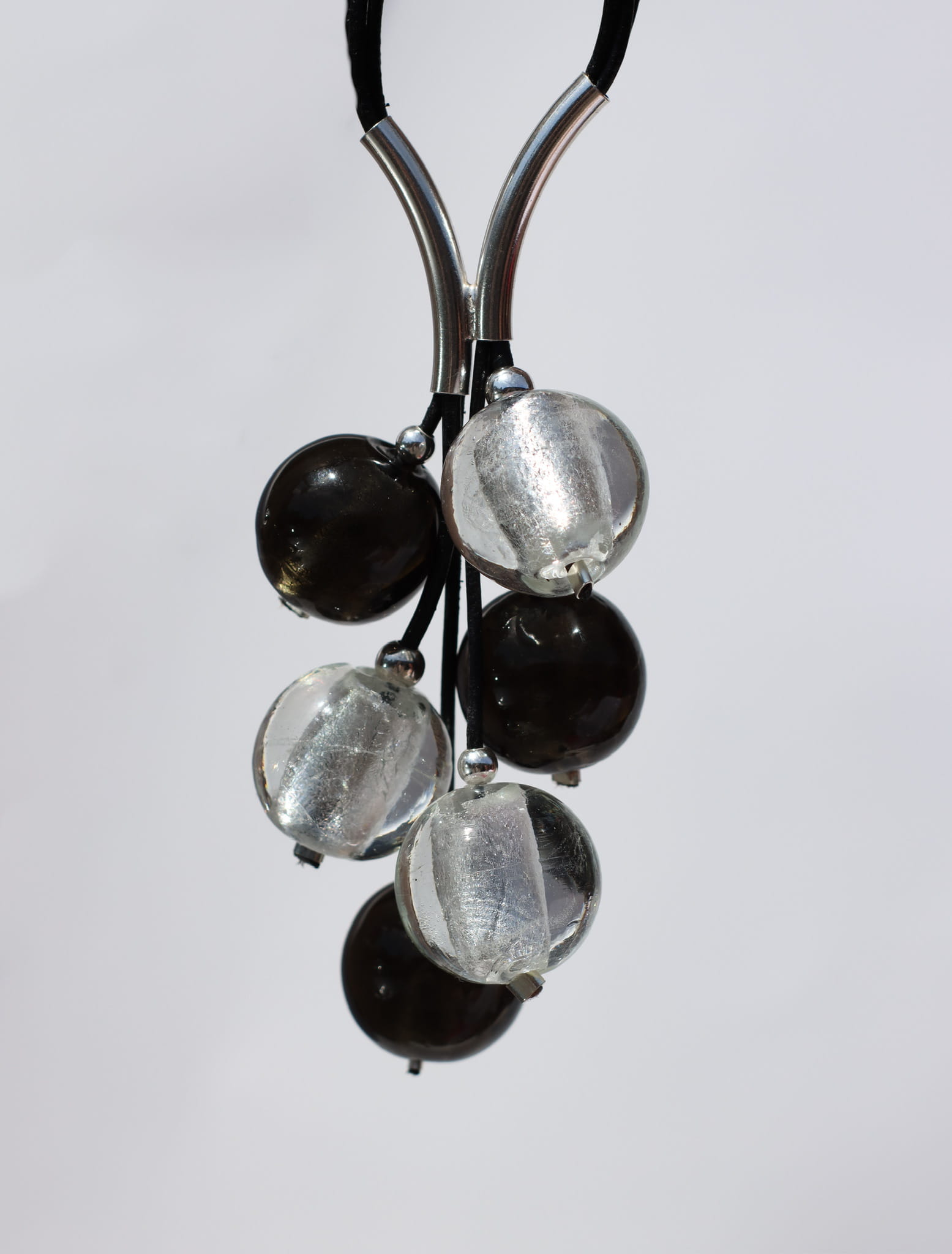 Naszyjnik Grono wykonany z kulek biało-szarego szkła weneckiego, srebra pr.925 oraz rzemienia w czarnym kolorze.